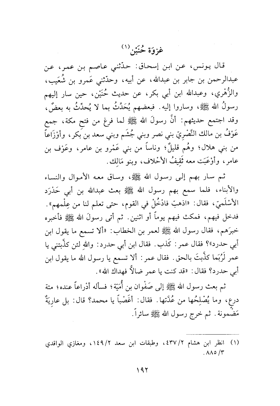 قال يونس، عن ابن إسحاق: حدثني عاصم بن عمر، عن عبد الرحمن بن جابر بن عبد الله، عن أبيه، وحدثني عمرو بن شعيب، والزهري، وعبد الله بن أبي بكر، عن حديث حنين، حين سار إليهم رسول الله صلى الله عليه وسلم، وساروا إليه. فبعضهم يحدث بما لا يحدث به بعض، وقد اجتمع حديثهم: أن رسول الله صلى الله عليه وسلم لما فرغ من فتح مكة، جمع عوف بن مالك النصري بني نصر وبني جشم وبني سعد بن بكر، وأوزاعا من بني هلال؛ وهم قليل؛ وناسا من بني عمرو بن عامر، وعوف بن عامر، وأوعبت معه ثقيف الأحلاف، وبنو مالك.