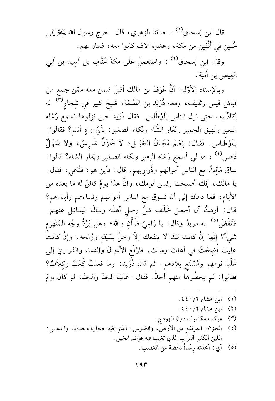 وبالإسناد الأول: أن عوف بن مالك أقبل فيمن معه ممن جمع من قبائل قيس وثقيف، ومعه دريد بن الصمة؛ شيخ كبير في شجار له يقاد به، حتى نزل الناس بأوطاس. فقال دريد حين نزلوها فسمع رغاء البعير ونهيق الحمير ويعار الشاء وبكاء الصغير: بأي واد أنتم؟ فقالوا: بأوطاس. فقال: نعم مجال الخيل، لا حزن ضرس، ولا سهل دهس، ما لي أسمع رغاء البعير وبكاء الصغير ويعار الشاء؟ قالوا: ساق مالك مع الناس أموالهم وذراريهم. قال: فأين هو؟ فدعي، فقال: يا مالك، إنك أصبحت رئيس قومك، وإن هذا يوم كائن له ما بعده من الأيام، فما دعاك إلى أن تسوق مع الناس أموالهم ونساءهم وأبناءهم؟ قال: أردت أن أجعل