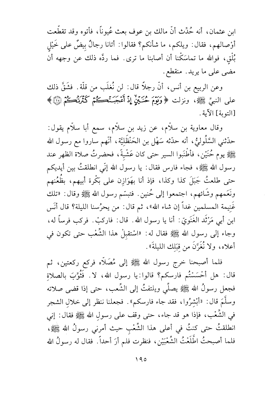 فلما أصبحنا خرج رسول الله صلى الله عليه وسلم إلى مصلاة فركع ركعتين، ثم قال: "هل أحسستم فارسكم"؟ قالوا: يا رسول الله، لا. فثوب بالصلاة فجعل رسول الله صلى الله عليه وسلم يصلي ويلتفت إلى الشعب، حتى إذا قضى صلاته وسلم قال: "أبشروا، فقد جاء فارسكم". فجعلنا ننظر إلى خلال الشجر في الشعب، فإذا هو قد جاء، حتى وقف على رسول الله صلى الله عليه وسلم فقال: إني انطلقت حتى كنت في أعلى هذا الشعب حيث أمرني رسول الله صلى الله عليه وسلم، فلما أصبحت اطلعت الشعبين، فنظرت فلم أر أحدا. فقال له رسول الله صلى الله عليه وسلم: "هل نزلت الليلة"؟ قال: لا، إلا مصليا أو قاضي حاجة. فقال له رسول الله