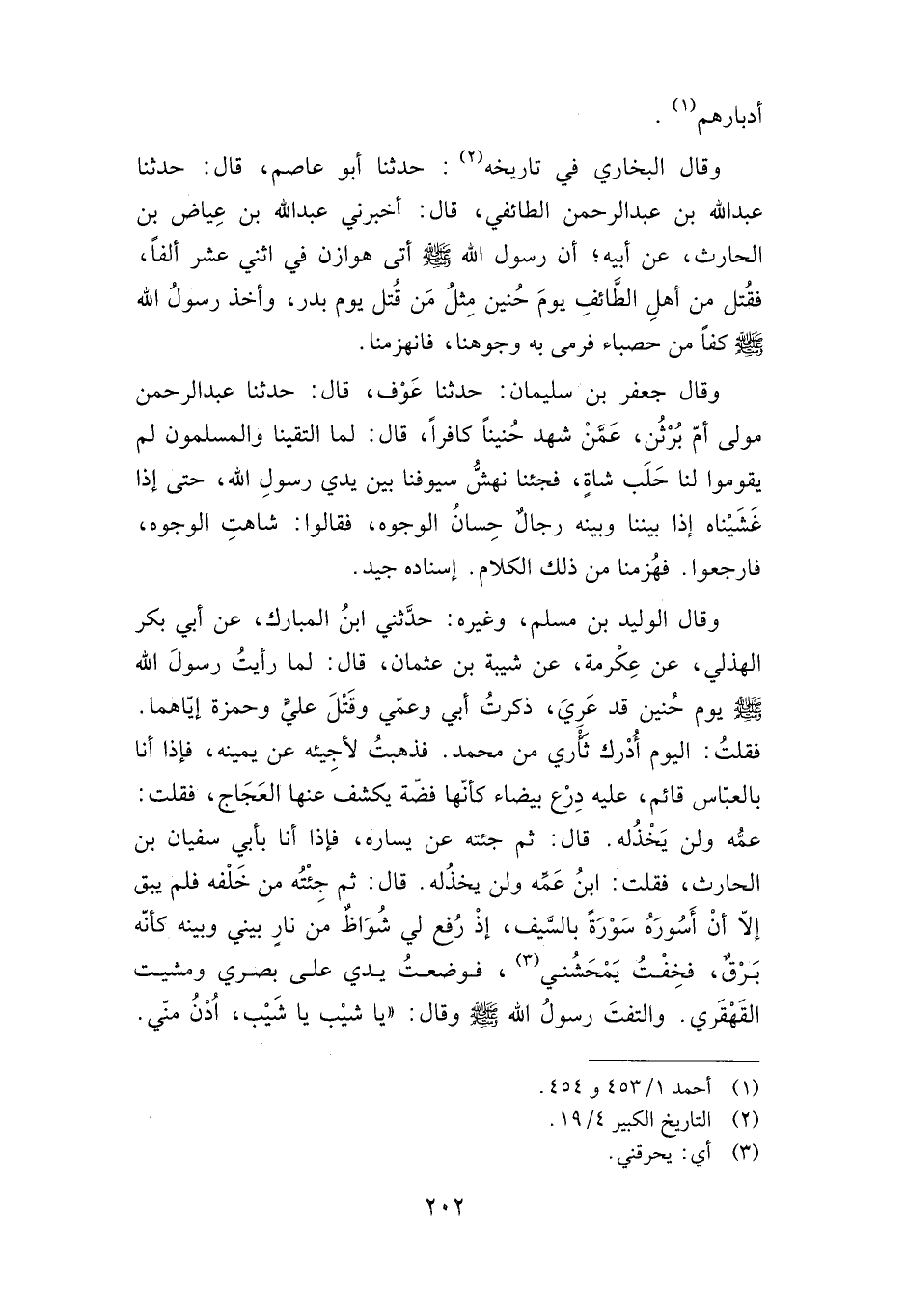 وقال البخاري في تاريخه: حدثنا أبو عاصم، قال: حدثنا عبد الله بن عبد الرحمن الطائفي، قال: أخبرني عبد الله بن عياض بن الحارث، عن أبيه؛ أن رسول الله صلى الله عليه وسلم أتى هوازن في اثني عشر ألفا، فقتل من أهل الطائف يوم حنين مثل من قتل يوم بدر، وأخذ رسول الله صلى الله عليه وسلم كفا من حصباء فرمى به وجوهنا، فانهزمنا.
