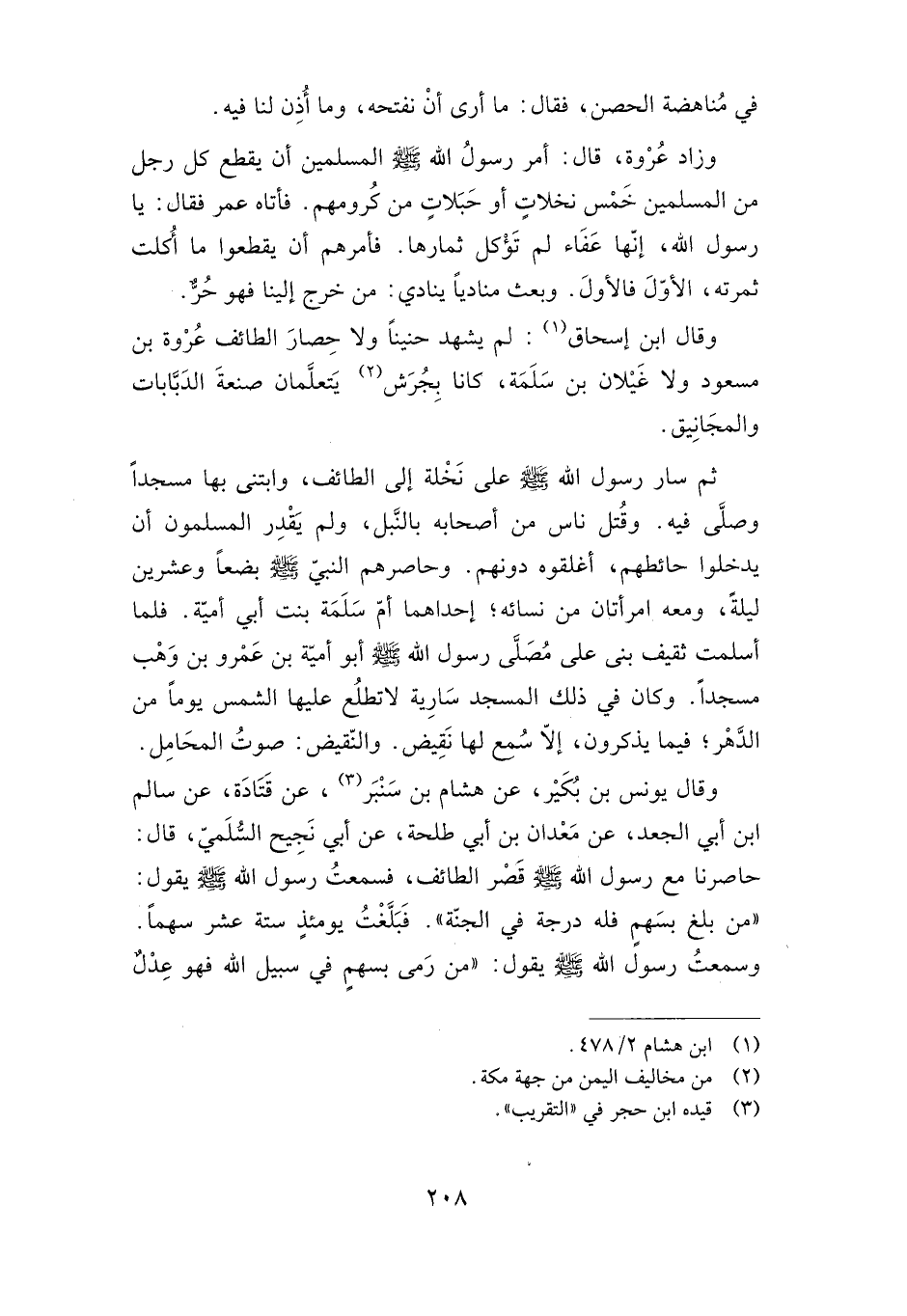 ثم سار رسول الله صلى الله عليه وسلم على نخلة إلى الطائف، وابتنى بها مسجدا وصلى فيه. وقتل ناس من أصحابه بالنبل، ولم يقدر المسلمون أن يدخلوا حائطهم، أغلقوه دونهم. وحاصرهم النبي صلى الله عليه وسلم بضعا وعشرين ليلة، ومعه امرأتان من نسائه؛ إحداهما أم سلمة بنت أبي أمية. فلما أسلمت ثقيف بنى علي مصلى رسول الله صلى الله عليه وسلم أبو أمية بن عمرو بن وهب مسجدا. وكان في ذلك المسجد سارية لا تطلع عليها الشمس يوما من الدهر؛ فيما يذكرون، إلا سمع لها نقيض.