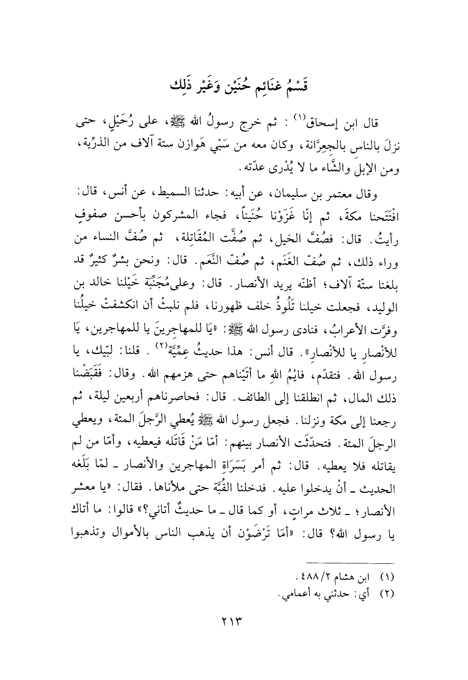 وقال معتمر بن سليمان، عن أبيه: حدثنا السميط، عن أنس، قال: افتتحنا مكة، ثم إنا غزونا حنينا، فجاء المشركون بأحسن صفوت رأيت. قال: فصف الخيل، ثم صفت المقاتلة، ثم صف النساء من وراء ذلك، ثم صف الغنم، ثم صف النعم. قال: ونحن بشر كثير قد بلغنا ستة آلاف؛ أظنه يريد الأنصار. قال: وعلي مجنبة خيلنا خالد بن الوليد، فجعلت خيلنا تلوذ خلف ظهورنا، فلم نلبث أن انكشفت خيلنا وفرت الأعراب، فنادى رسول الله صلى الله عليه وسلم: "يا للمهاجرين يا للمهاجرين، يا للأنصار يا للأنصار". قال أنس: هذا حديث عمية. قلنا: لبيك، يا رسول الله. فتقدم، فايم الله ما أتيناهم حتى هزمهم الله. وقال: فقبضنا ذلك المال، ثم انطلقنا إلى الطائف. قال فحاصرناهم أربعين ليلة، ثم رجعنا إلى مكة ونزلنا. فجعل رسول الله صلى الله عليه وسلم يعطي الرجل المائة، ويعطي الرجل المائة. فتحدثت الأنصار بينهم: أما من قاتله فيعطيه، وأما من لم يقاتله فلا يعطيه. قال: ثم أمر بسراة المهاجرين والأنصار -لما بلغه الحديث- أن يدخلوا عليه. فدخلنا القبة حتى ملأناها. فقال: "يا معشر الأنصار؛ -ثلاث مرات، أو كما قال- ما حديث أتاني"؟ قالوا: ما أتاك يا رسول الله؟ قال: "أما ترضون أن يذهب الناس بالأموال وتذهبوا