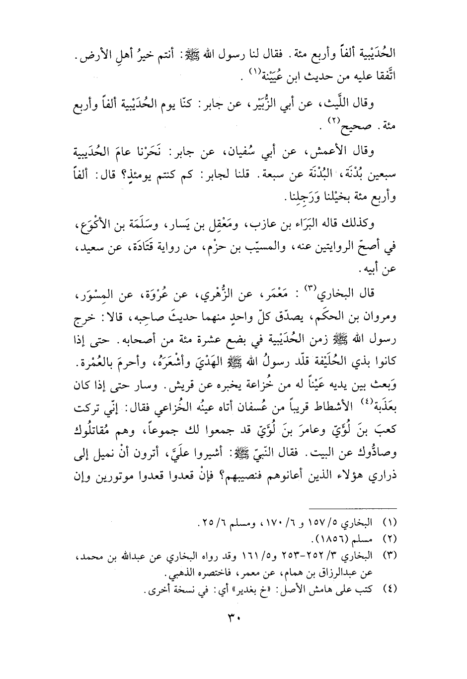 وقال الأعمش، عن أبي سفيان، عن جابر: نحرنا عام الحديبية سبعين بدنة، البدنة عن سبعة. قلنا لجابر: كم كنتم يومئذ؟ قال: ألفًا وأربع مائة بخيلنا ورجلنا.