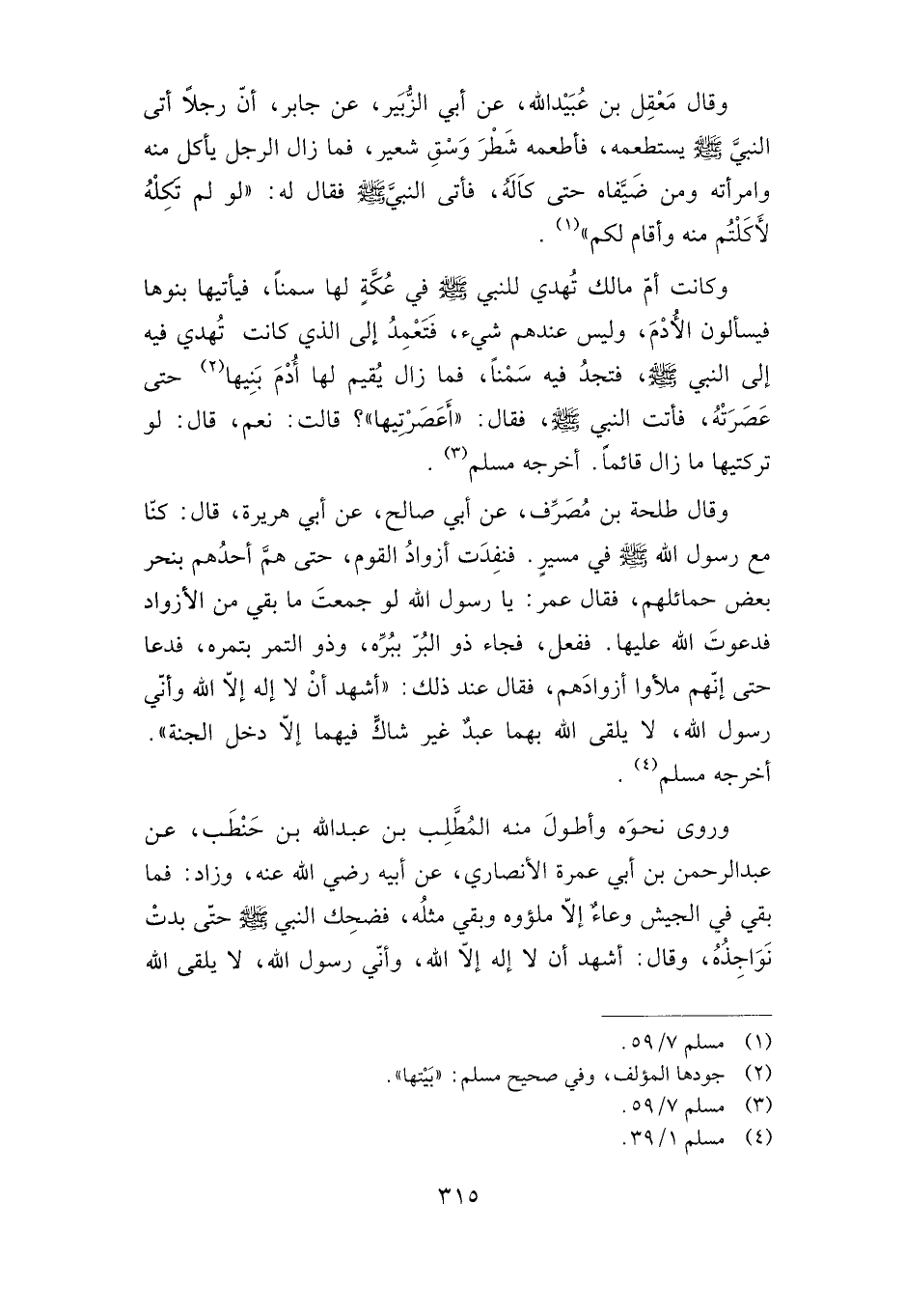وقال طلحة بن مصرف، عن أبي صالح، عن أبي هريرة، قال: كنا مع رسول الله صلى الله عليه وسلم في مسير. فنفدت أزواد القوم، حتى هم أحدهم بنحر بعض حمائلهم، فقال عمر: يا رسول الله لو جمعت ما بقي من الأزواد فدعوت الله عليها. ففعل، فجاء ذو البر ببره، وذو التمر بتمره، فدعا حتى إنهم ملأوا أزوادهم، فقال عند ذلك: "أشهد أن لا إله إلا الله وأني رسول الله، لا يلقى الله بهما عبد غير شاك فيهما إلا دخل الجنة". أخرجه مسلم.