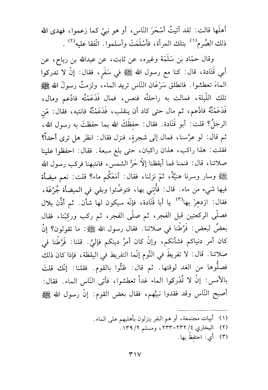 وقال حماد بن سلمة وغيره، عن ثابت، عن عبد الله بن رباح، عن أبي قتادة، قال: كنا مع رسول الله صلى الله عليه وسلم في سفر، فقال: "إن لا تدركوا الماء تعطشوا". فانطلق سرعان الناس تريد الماء، ولزمت رسول الله صلى الله عليه وسلم تلك الليلة، فمالت به راحلته فنعس، فمال فدعمته فادعم ومال، فدعمته فادعم، ثم مال حتى كاد أن ينقلب، فدعمته فانتبه، فقال: "من الرجل"؟ قلت: أبو قتادة. فقال: "حفظك الله بما حفظت به رسول الله"، ثم قال: "لو عرسنا"، فمال إلى شجرة، فنزل فقال: "انظر هل ترى أحدا"؟. فقلت: هذا راكب، هذان راكبان، حتى بلغ سبعة. فقال: "احفظوا علينا صلاتنا"، قال: فنمنا فما أيقظنا إلا حر الشمس، فانتبهنا فركب رسول الله صلى الله عليه وسلم وسار وسرنا هنية، ثم نزلنا، فقال: "أمعكم ماء"؟ قلت: نعم ميضأة فيها شيء من ماء. قال: فأتني بها، فتوضئوا وبقي في الميضأة جرعة، فقال: "ازدهر بها يا أبا قتادة، فإنه سيكون لها شأن"، ثم أذن بلال فصلى الركعتين قبل الفجر، ثم صلى الفجر، ثم ركب وركبنا، فقال بعض لبعض: فرطنا في صلاتنا. فقال رسول الله صلى الله عليه وسلم: "ما تقولون؟ إن كان أمر دنياكم فشأنكم، وإن كان أمر دينكم فإلي". قلنا: فرطنا في صلاتنا. قال: "لا تفريط في النوم إنما التفريط في اليقظة، فإذا كان ذلك فصلوها من الغد لوقتها". ثم قال: "ظنوا بالقوم". فقلنا: إنك قلت بالأمس: "إن لا تدركوا الماء غدا تعطشوا"، فأتى الناس الماء. فقال: "أصبح الناس وقد فقدوا نبيهم"، فقال بعض القوم: إن رسول الله صلى الله عليه وسلم