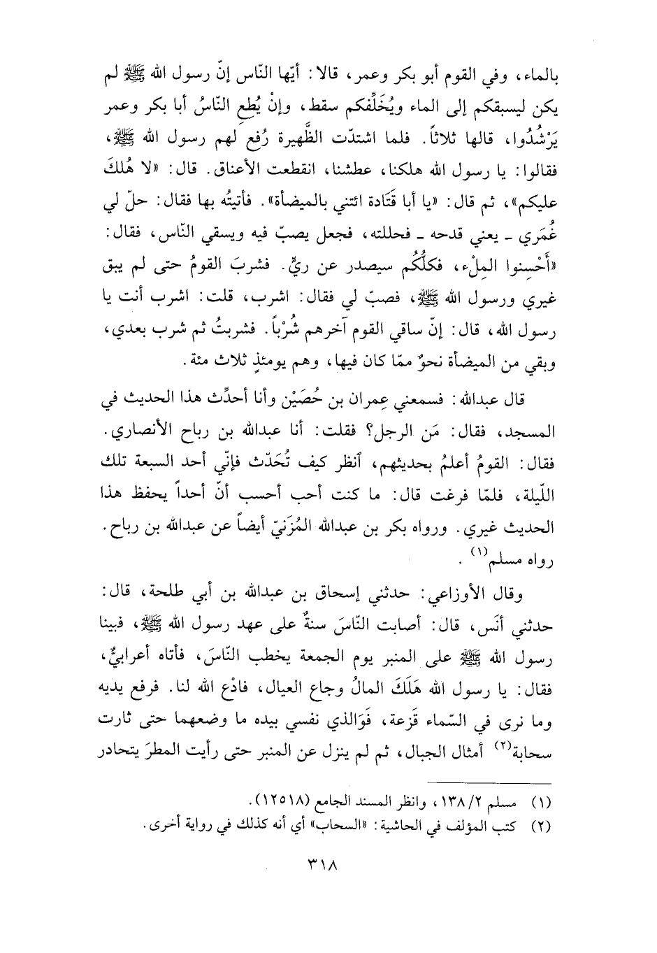 الناس، فقال: "أحسنوا الملء، فكلكم سيصدر عن ري". فشرب القوم حتى لم يبق غيري ورسول الله صلى الله عليه وسلم، فصب لي فقال: "اشرب"، قلت: اشرب أنت يا رسول الله، قال: "إن ساقي القوم آخرهم شربا". فشربت ثم شرب بعدي، وبقي من الميضأة نحو مما كان فيها، وهو يومئذ ثلاثة مائة.