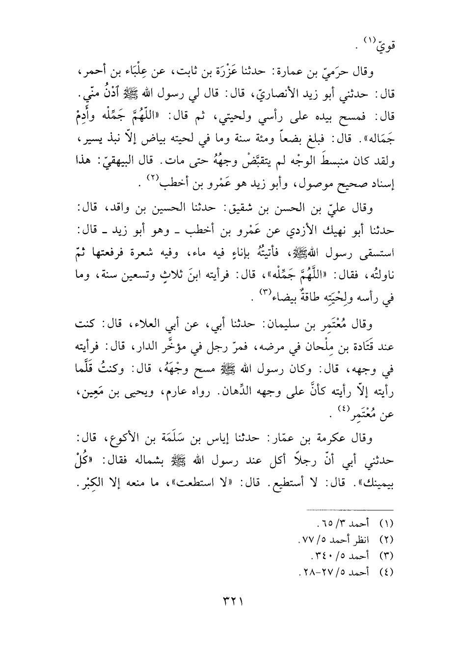 وقال حرمي بن عمارة: حدثنا عزرة بن ثابت، عن علباء بن أحمر، قال: حدثني أبو زيد الأنصاري، قال: قال لي رسول الله صلى الله عليه وسلم: "ادن مني". قال: فمسح بيده على رأسي ولحيتي، ثم قال: "اللهم جمله وأدم جماله". قال: فبلغ بضعا ومائة سنة وما في لحيته بياض إلا نبذ يسير، ولقد كان منبسط الوجه لم يتقبض وجهه حتى مات. قال البيهقي: هذا إسناد صحيح موصول، وأبوزيد هو عمرو بن أخطب.