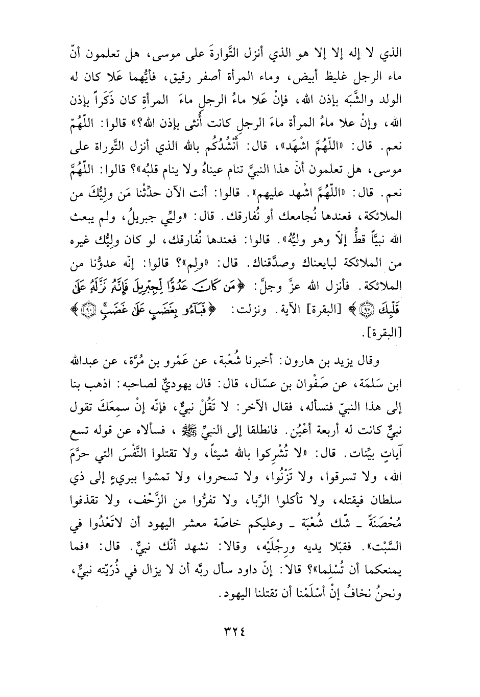 وقال يزيد بن هارون: أخبرنا شعبة، عن عمرو بن مرة، عن عبد الله بن سلمة، عن صفوان بن عسال، قال: قال يهودي لصاحبه: اذهب بنا إلى هذا النبي فنسأله، فقال الآخر: لا تقل نبي، فإنه إن سمعك تقول: نبي كانت له أربعة أعين. فانطلقا إلى النبي صلى الله عليه وسلم، فسألاه عن قول تسع آيات بينات. قال: "لا تشركوا بالله شيئا، ولا تقتلوا النفس التي حرم الله، ولا تسرقوا، ولا تزنوا، ولا تسحروا، ولا تمشوا ببريء إلى ذي سلطان فيقتله، ولا تأكلوا الربا، ولا تفروا من الزحف، ولا تقذفوا محصنة -شك شعبة- وعليكم خاصة معشر اليهود أن لا تعدوا في السبت". فقبلا يديه ورجليه، وقالا: نشهد أنك نبي قال: "فما يمنعكما أن تسلما"؟ قالا: إن داود سأل ربه أنه لا يزال في ذريته نبي، ونحن نخاف إن أسلمنا أن تقتلنا اليهود.