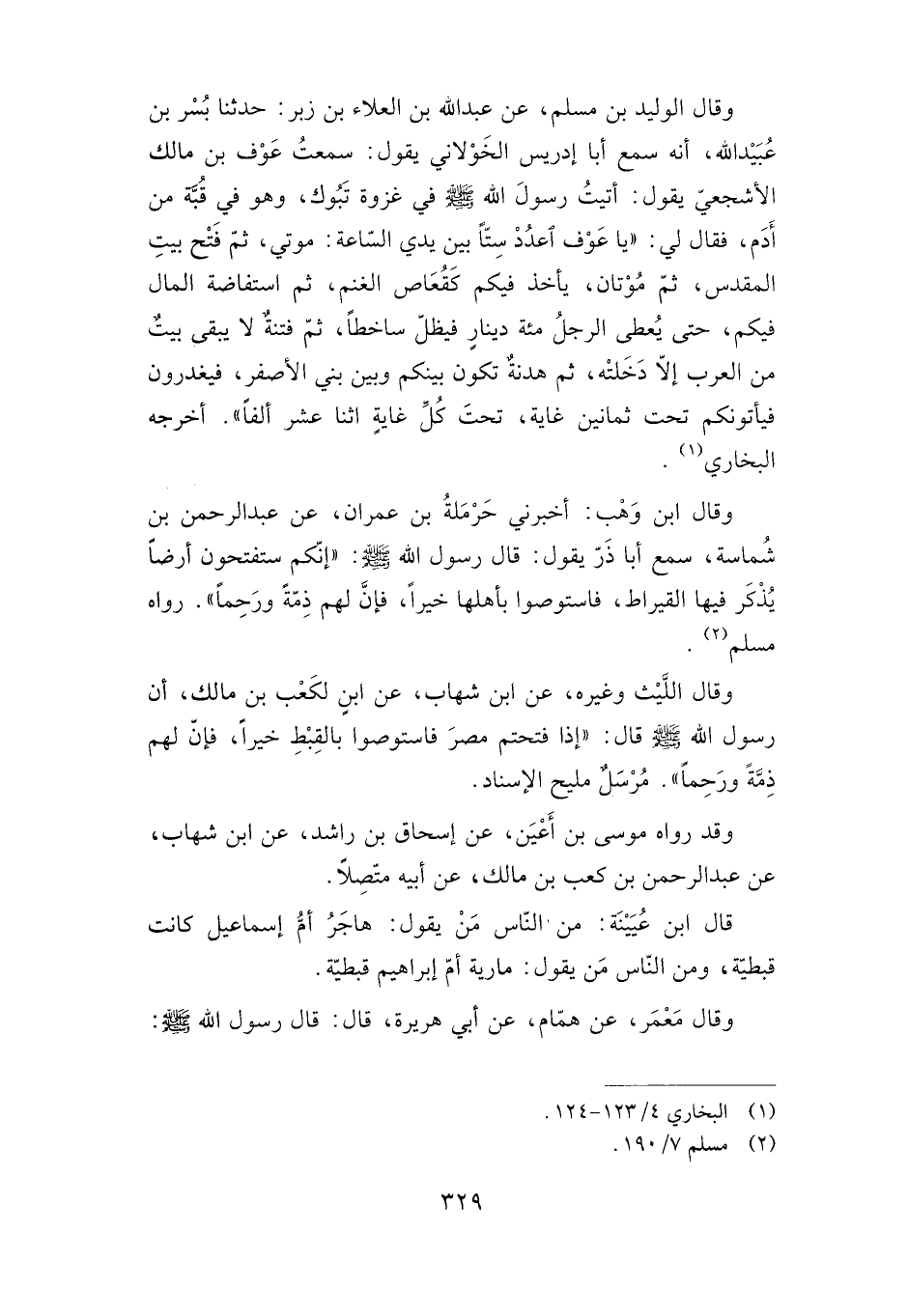 قال الليث وغيره، عن ابن شهاب، عن ابن لكعب بن مالك، أن رسول الله صلى الله عليه وسلم قال: "إذا فتحتم مصر فاستوصوا بالقبط خيرا، فإن لهم ذمة ورحما". مرسل مليح الإسناد.
