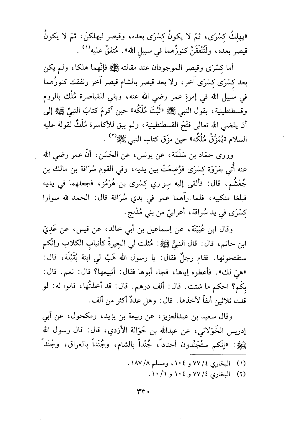 "يهلك كسرى، ثم لا يكون كسرى بعده، وقيصر ليهلكن، ثم لا يكون قيصر بعده، ولتنفقن كنوزهما في سبيل الله". متفق عليه.