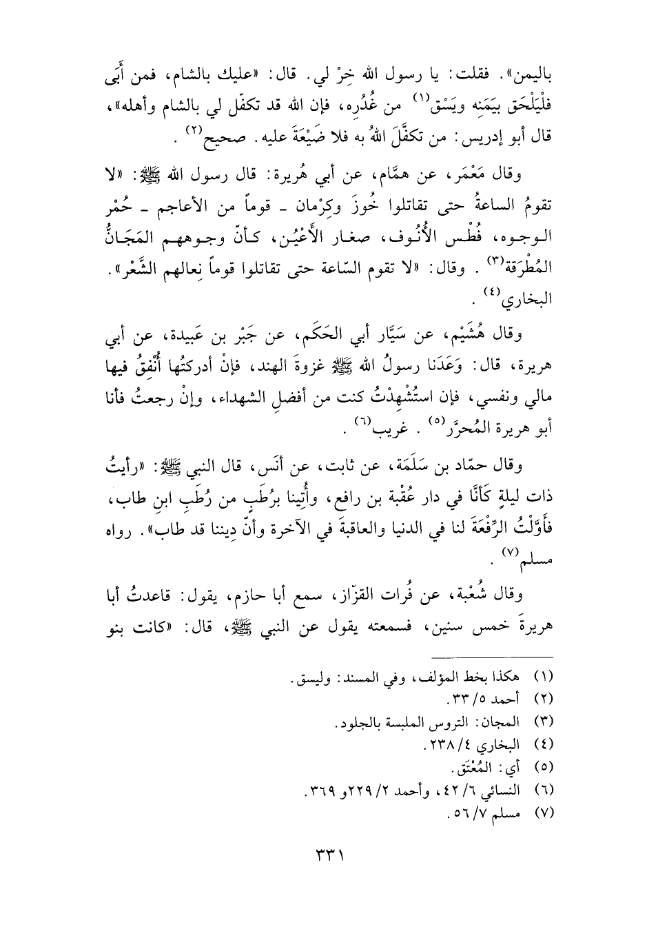 وقال معمر، عن همام، عن أبي هريرة: قال رسول الله صلى الله عليه وسلم: "لا تقوم الساعة حتى تقاتلوا خوز وكرمان -قوما من الأعاجم- حمر الوجوه، فطس الأنوف، صغار الأعين، كأن وجوههم المجان المطرقة". وقال: "لا تقوم الساعة حتى تقاتلوا قوما نعالهم الشعر". البخاري.