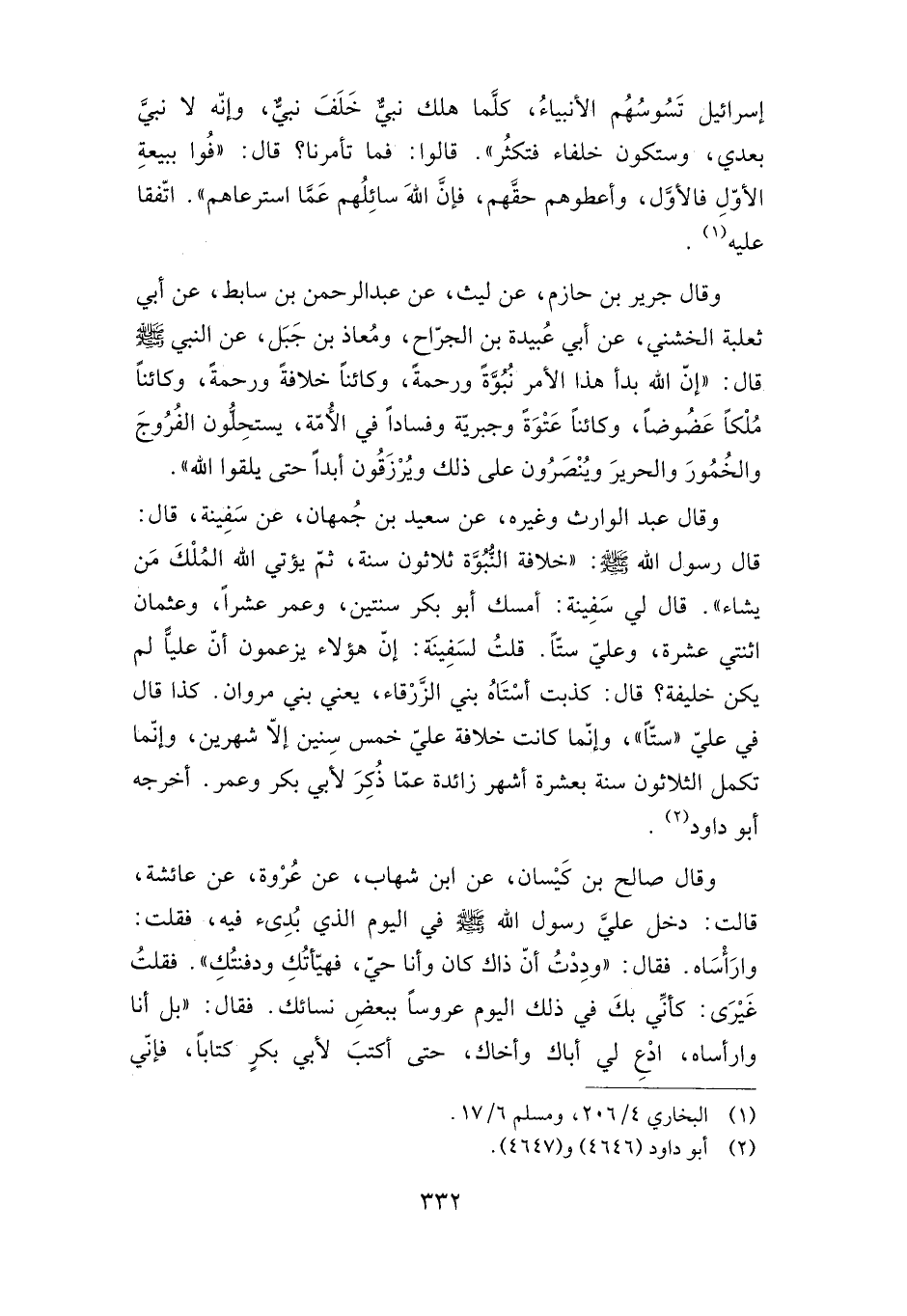 إسرائيل تسوسهم الأنبياء، كلما هلك نبي خلف نبي، وإنه لا نبي بعدي، وستكون خلفاء فتكثر". قالوا: فما تأمرنا؟ قال: "فوا ببيعة الأول فالأول، وأعطوهم حقهم، فإن الله سائلهم عما استرعاهم". اتفقا عليه.