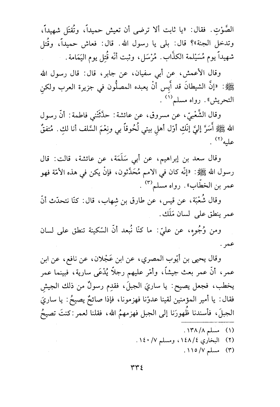 فقال: "يا ثابت ألا ترضى أن تعيش حميدا، وتقتل شهيدا، وتدخل الجنة"؟ قال: بلى يا رسول الله صلى الله عليه وسلم. قال: فعاش حميدا، وقتل شهيدا يوم مسيلمة الكذاب. مرسل، وثبت أنه قتل يوم اليمامة.
