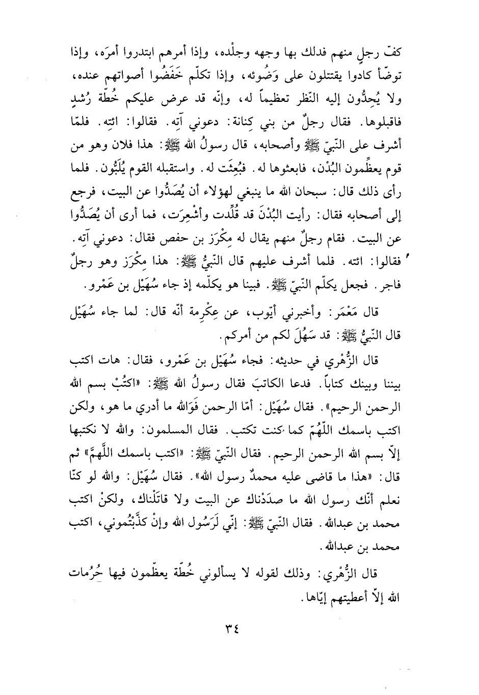 قال الزهري في حديثه: فجاء سهيل بن عمرو، فقال: هات اكتب بيننا وبينك كتابًا.