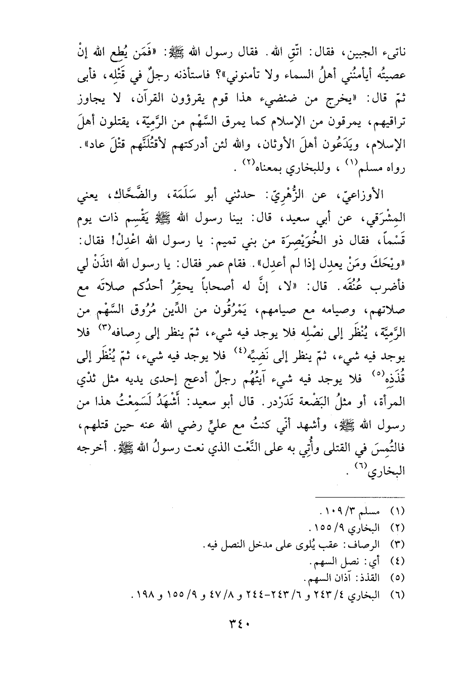 الأوزاعي، عن الزهري: حدثني أبو سلمة، والضحاك، يعني المشرقي، عن أبي سعيد، قال: بينا رسول الله صلى الله عليه وسلم يقسم ذات يوم قسما، فقال ذو الخويصرة من بني تميم: يا رسول الله صلى الله عليه وسلم اعدل! فقال: "ويحك ومن يعدل إذا لم أعدل" فقام عمر قال: يا رسول الله ائذن لي فأضرب عنقه قال: "لا، إن له أصحابا يحقر أحدكم صلاته مع صلاتهم، وصيامه مع صيامهم يمرقون من الدين مروق السهم من الرمية، ينظر إلى نصله فلا يوجد في شيء ثم ينظر إلى رصافة فلا يوجد فيه شيء، ثم ينظر إلى نضيه فلا يوجد فيه شيء، ثم ينظر إلى قذذه فلا يوجد فيه شيء آيتهم رجل أدعج إحدى يديه مثل ثدي المرأة، أو مثل البضعة تدردر". قال أبو سعيد: أشهد لسمعت هذا من رسول الله صلى الله عليه وسلم، وأشهد أني كنت مع علي -رضي الله عنه- حين قتلهم فالتمس في القتلى وأتى به على النعت الذي نعت رسول الله صلى الله عليه وسلم. أخرجه البخاري.