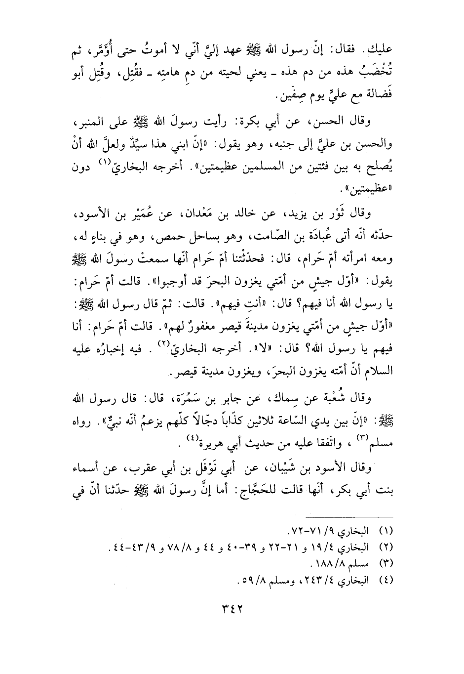 وقال ثور بن يزيد، عن خالد بن معدان، عن عمير بن الأسود، حدثه أنه أتى عبادة بن الصامت، وهو بساحل حمص، وهو في بناء له، ومعه امرأته أم حرام، قال: فحدثتنا أم حرام أنها سمعت رسول الله صلى الله عليه وسلم يقول: "أول جيش من أمتي يغزون البحر قد أوجبوا" قالت أم حرام: يا رسول الله أنا فيهم؟ قال: "أنت فيهم" قال: ثم قال رسول الله صلى الله عليه وسلم: "أول جيش من أمتي يغزون مدينة قيصر مغفور لهم" قالت أم حرام: أنا فيهم يا رسول الله؟ قال: "لا" أخرجه البخاري فيه إخباره -عليه السلام- أن أمته يغزون البحر، ويغزون مدينة