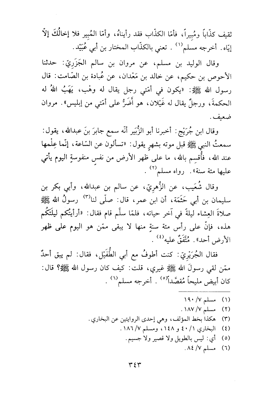 وقال ابن جريج: أخبرنا أبو الزبير أنه سمع جابر بن عبد الله يقول: سمعت النبي صلى الله عليه وسلم قبل موته بشهر يقول: "تسألون عن الساعة، إنما علمها عند اله فأقسم بالله، ما على ظهر الأرض من نفس منفوسة اليوم يأتي عليها مائة سنة". رواه مسلم.