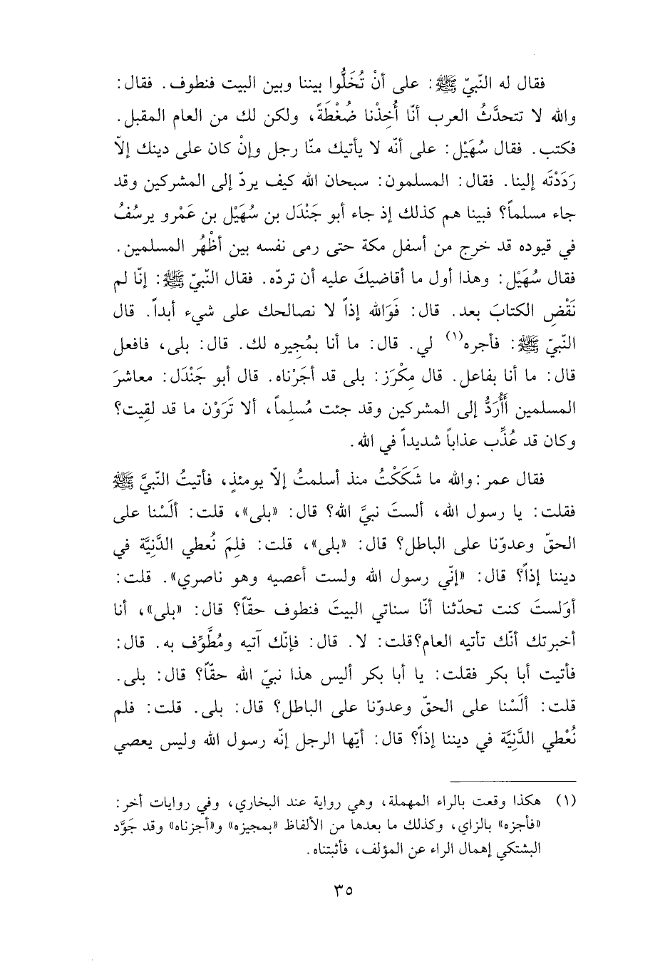 فقال عمر: والله ما شككت منذ أسلمت إلا يومئذ، فأتيت النبي صلى الله عليه وسلم فقلت: يا رسول الله، ألست نبي الله؟ قال: "بلى"، قلت: ألسنا على الحق وعدونا على الباطل؟ قال: "بلى"، قلت: فلم نعطي الدنية في ديننا إذا؟ قال: "إني رسول الله ولست أعصيه وهو ناصري". قلت: أولست كنت تحدثنا أنا سنأتي البيت فنطوف حقا؟ قال: "بلي"، أنا أخبرتك أنك تأتيه العام؟ قلت: لا. قال: "فإنك آتيه ومطوف به". قال: فأتيت أبا بكر فقلت: يا أبا بكر أليس هذا نبي الله حقا؟ قال: بلي. قلت: ألسنا على الحق وعدونا على الباطل؟ قال: بلى.