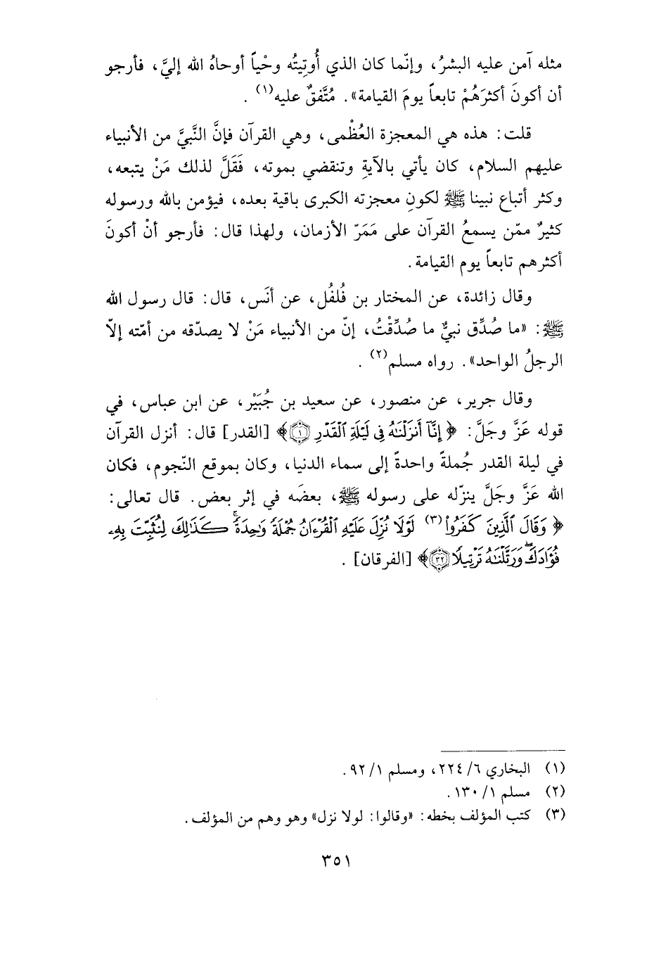 مثله آمن عليه البشر، وإنما كان الذي أوتيته وحيا أوحاه الله إلي، فأرجو أن أكون أكثرهم تابعا يوم القيامة". متفق عليه.
