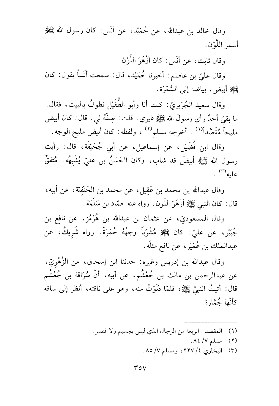 رسول الله صلى الله عليه وسلم غيري. قلت: صفه لي. قال: كان أبيض مليحا مقصدا. أخرجه مسلم، ولفظه: كان أبيض مليح الوجه.