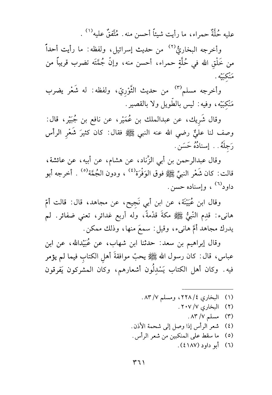 وقال عبد الرحمن بن أبي الزناد، عن هشام، عن أبيه، عن عائشة، قالت: كان شعر النبي صلى الله عليه وسلم فوق الوفرة، ودون الجمة. أخرجه أبو داود، وإسناده حسن.