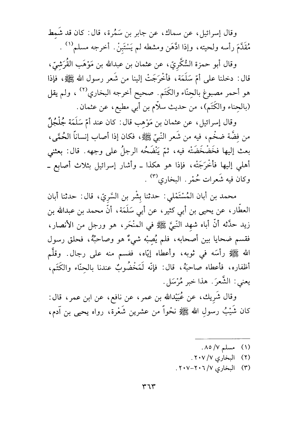 وقال أبو حمزة السكري، عن عثمان بن عبد الله بن موهب القرشي، قال: دخلنا على أم سلمة، فأخرجت إلينا من شعر رسول اله صلى الله عليه وسلم، فإذا هو أحمر مصبوغ بالحناء والكتم.