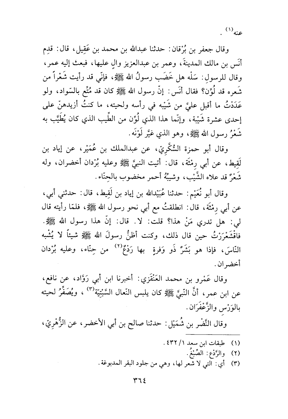 وقال عمرو بن محمد العنقزي: أخبرنا ابن أبي رواد، عن نافع، عن ابن عمر، أن النبي صلى الله عليه وسلم كان يلبس النعال السبتية، ويصفر لحيته بالورس والزعفران.
