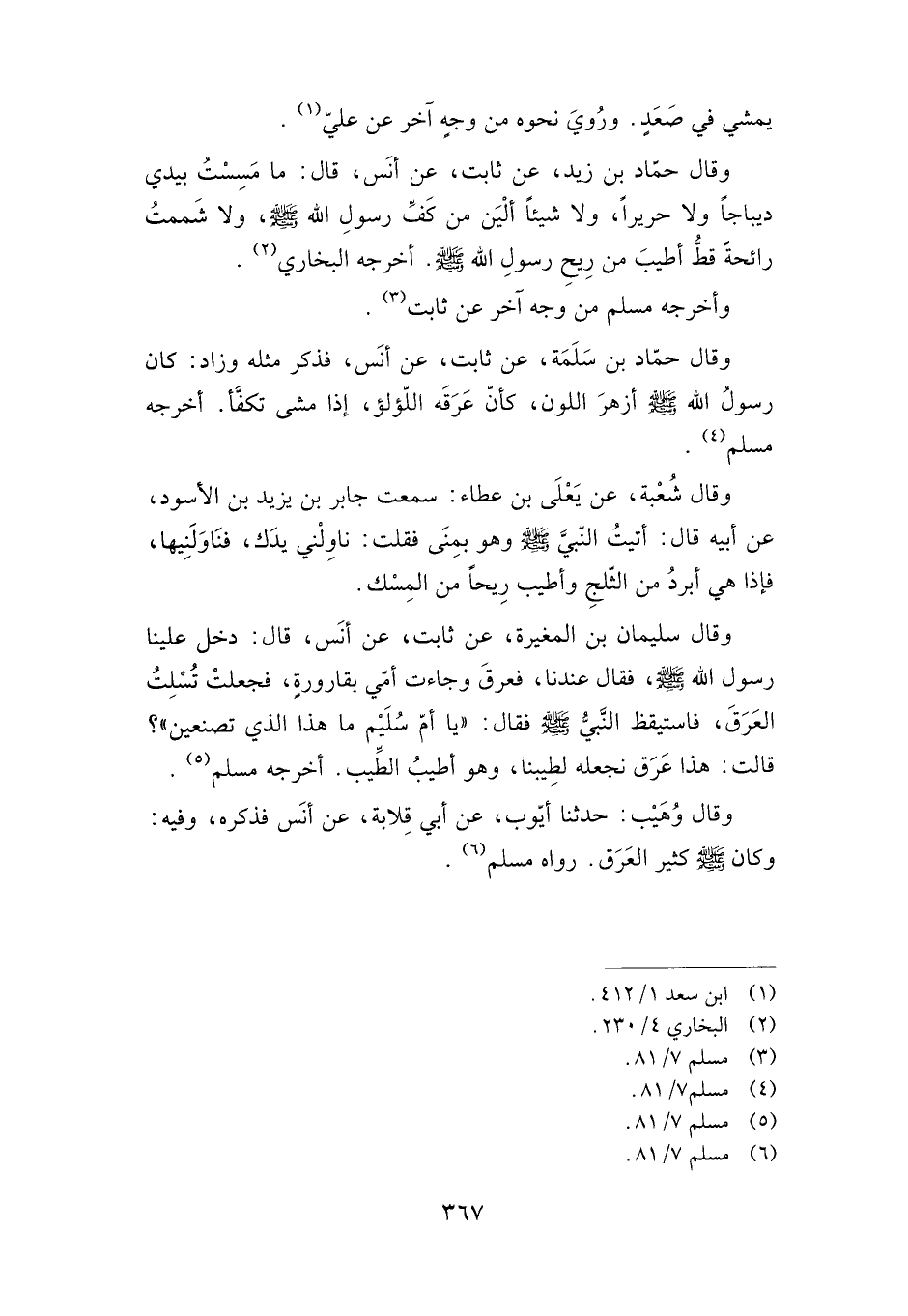 وقال حماد بن سلمة، عن ثابت، عن أنس، فذكر مثله وزاد: كان رسول الله صلى الله عليه وسلم أزهر اللون، كأن عرقه اللؤلؤ، إذ مشى تكفأ. أخرجه مسلم.