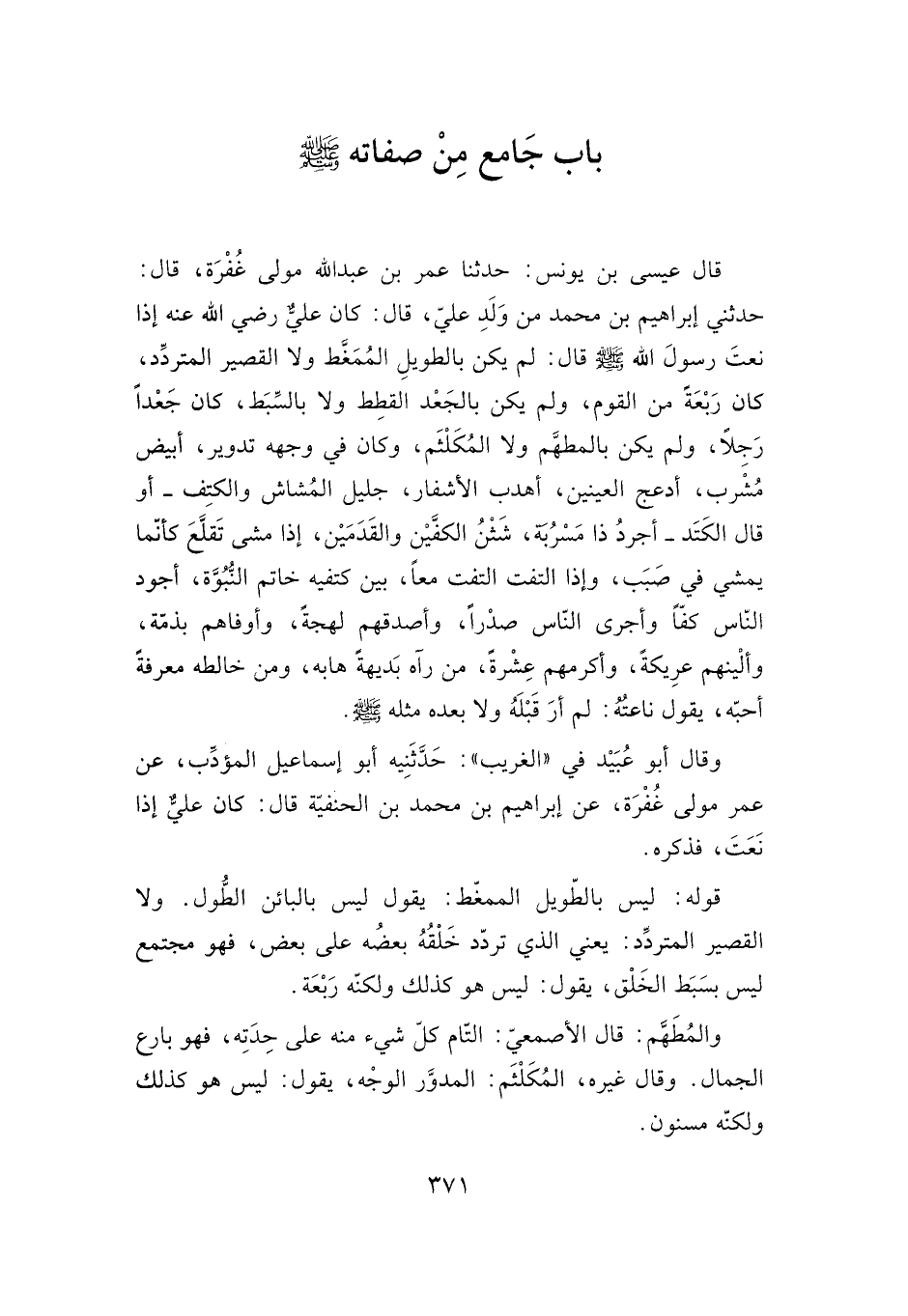 قال عيسى بن يونس: حدثنا عمر بن عبد الله مولى غفرة، قال: حدثني إبراهيم بن محمد من ولد علي، قال: كان علي -رضي الله عنه- إذا نعت رسول صلى الله عليه وسلم قال: لم يكن بالطويل الممغط ولا القصير المتردد، كان ربعة من القوم، ولم يكن بالجعد القطط ولا بالسبط، كان جعدا رجلا، ولم يكن بالمطهم ولا المكلثم، وكان في وجهه تدوير، أبيض مشرب، أدعج العينين، أهدب الأشفار، جليل المشاش والكتف -أو قال الكتد- أجرد ذا مسربة، شثن الكفين والقدمين، إذا مشى تقلع كأنما يمشي في صبب، وإذا التفت التفت معا، بين كتفيه خاتم النبوة، أجود الناس كفا وأجرى الناس صدرا، وأصدقهم لهجة، وأوفاهم بذمة، وألينهم عريكة، وأكرمهم عشرة، من رآه بديهة هابه، ومن خالطه معرفة أحبه، يقول ناعته: لم أر قبله ولا بعده مثله صلى الله عليه وسلم.