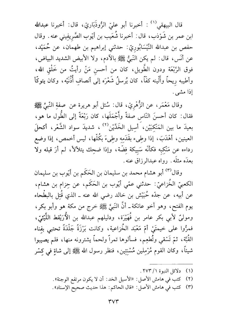 قال البيهقي: أخبرنا أبو علي الروذباري، قال: أخبرنا عبد الله بن عمر بن شوذب، قال: أخبرنا شعيب بن أيوب الصريفيني عنه. وقال حفص بن عبد الله النيسابوري: حدثني إبراهيم بن طهمان، عن حميد، عن أنس، قال: لم يكن النبي صلى الله عليه وسلم بالآدم، ولا الأبيض الشديد البياض، فوق الربعة ودون الطويل، كان من أحسن من رأيت من خلق الله، وأطيبه ريحا وألينه كفا، كان يرسل شعره إلى أنصاف أذنيه، وكان يتوكأ إذا مشى.