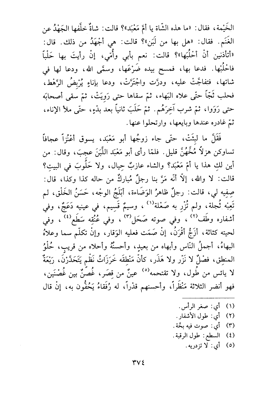 فقل ما لبثت، حتى جاء زوجها أبو معبد، يسوق أعنزا عجافا تساوكن هزلا مخهن قليل. فلما رأي أبو معبد اللبن عجب، وقال: من أين لك هذا يا أم معبد؟ والشاء عازب حيال، ولا حلوب في البيت؟ قالت: لا والله، إلا أنه مر بنا رجل مبارك من حاله كذا وكذا، قال: صفيه لي، قالت: رجل ظاهر الوضاءة، أبلج الوجه، حسن الخلق، لم تعبه ثجلة، ولم تزر به صعلة، وسيم قسيم، في عينيه دعج، وفي أشفاره وطف، وفي صوته صحل، وفي عنقه سطع، وفي لحيته كثاثة، أزج أقرن، إن صمت فعليه الوقار، وإن تكلم سما وعلاه البهاء، أجمل الناس وأبهاه من بعيد، وأحسنه وأحلاه من قريب، حلو المنطق، فصل لا نزر ولا هذر، كأن منطقه خرزات نظم يتحدرن، ربعة لا يائس من طول، ولا تقتحمه عين من قصر، غصن بين غصنين، فهو أنضر الثلاثة منظرًا، وأحسنهم قدرا، له رفقاء يحفون به، إن قال