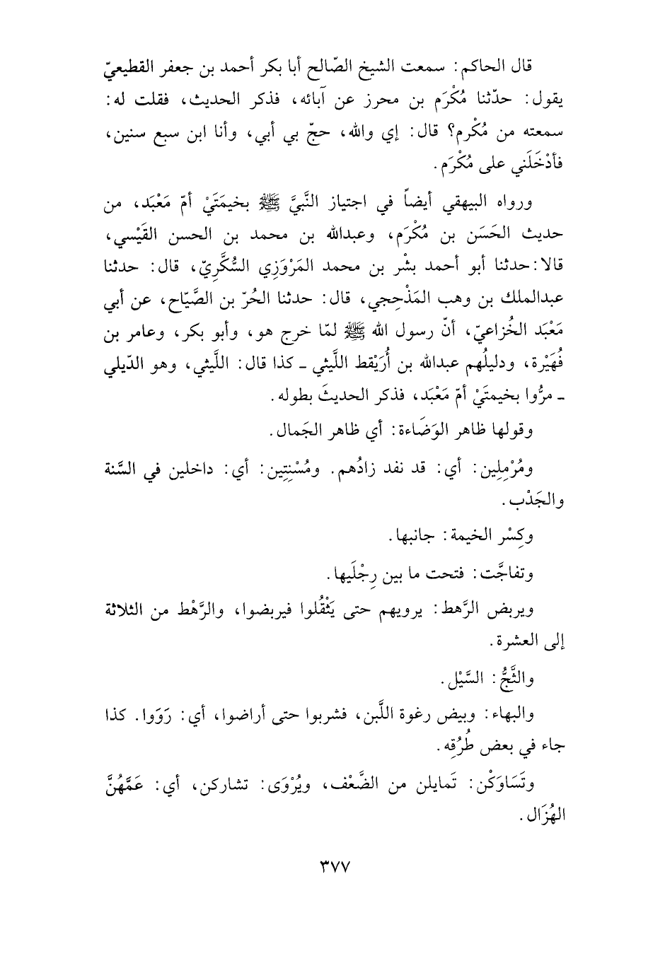 وقال الحاكم: سمعت الشيخ الصالح أبا بكر أحمد بن جعفر القطيعي يقول: حدثنا مكرم بن محرز عن آبائه، فذكر الحديث، فقلت له: سمعته من مكرم؟ قال: إي والله، حج بي أبي، وأنا ابن سبع سنين، فأدخلني على مكرم.