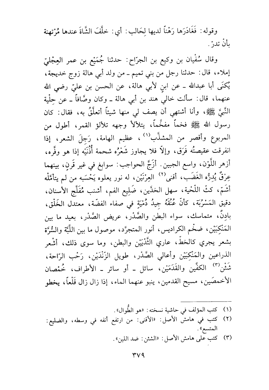 قال سفيان بن وكيع بن الجراح: حدثنا جميع بن عمر العجلي إملاء، قال: حدثنا رجل من بني تميم -من ولد أبي هالة زوج خديجة، يكنى أبا عبد الله- عن ابن لأبي هالة، عن الحسن بن علي -رضي الله عنهما- قال: سألت خالي هند بن أبي هالة -وكان وصافا- عن حلية النبي صلى الله عليه وسلم، وأنا أشتهي أن يصف لي منها شيئا أتعلق به، فقال: كان رسول الله صلى الله عليه وسلم فخما مفخما، يتلألأ وجهه تلألؤ القمر، أطول من المربوع وأقصر من المشذب، عظيم الهامة، رجل الشعر، إذا انفرقت عقيصته فرق، وإلا فلا يجاوز شعره شحمة أذنيه إذا هو وفره، أزهر اللون، واسع الجبين. أزج الحواجب: سوابغ في غير قرن، بينهما عرق يدره الغضب، أقنى العرنين، له نور يعلوه يحسبه من لم يتأمله أشم، كث اللحية، سهل الخدين، ضليع الفم، أشنب مفلج الأسنان، دقيق المسربة، كأن عنقه جيد دمية في صفاء الفضة، معتدل الخلق، بادن، متماسك، سواء البطن والصدر، عريض الصدر، بعيد ما بين المنكبين، ضخم الكراديس، أنور المتجرد، موصول ما بين اللبة والسرة بشعر يجري كالخط، عاري الثديين والبطن، وما سوى ذلك، أشعر الذراعين والمنكبين وأعالي الصدر، طويل الزندين، رحب الراحة، شثن الكفين والقدمين، سائل -أو سائر- الأطراف، خمصان الأخمصين، مسيح