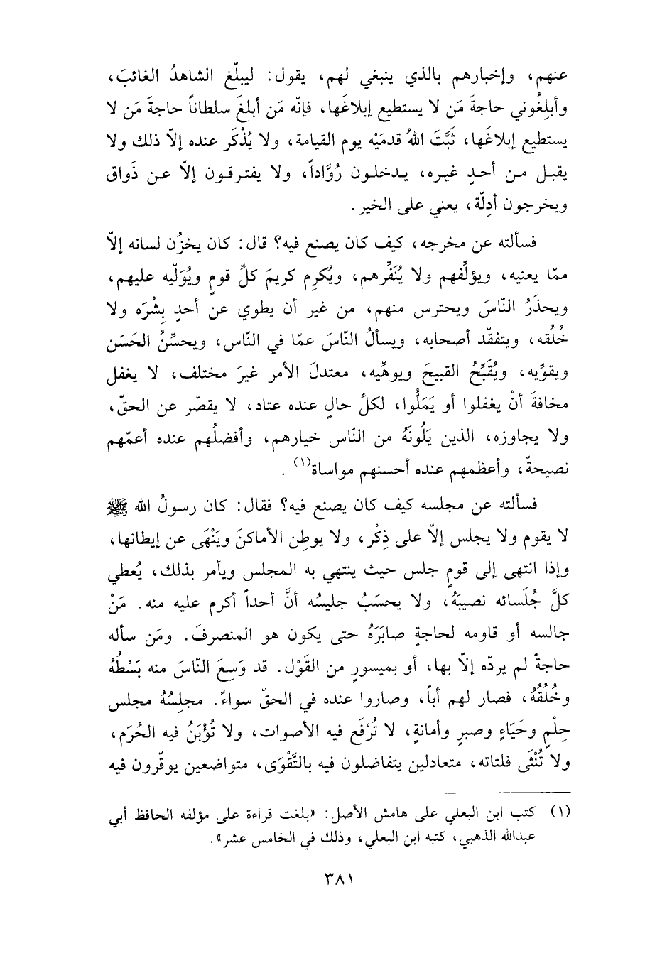 فسألته عن مخرجه، كيف كان يصنع فيه؟ قال: كان يخزن لسانه إلا مما يعنيه، ويؤلفهم ولا ينفرهم، ويكرم كريم كل قوم ويوليه عليهم، ويحذر الناس ويحترس منهم، من غير أن يطوي عن أحد بشره ولا خلقه، ويتفقد أصحابه، ويسأل الناس عما في الناس، ويحسن الحسن ويقويه، ويقبح القبيح ويوهيه، معتدل الأمر غير مختلف، لا يغفلوا مخافة أن يغفلوا أو