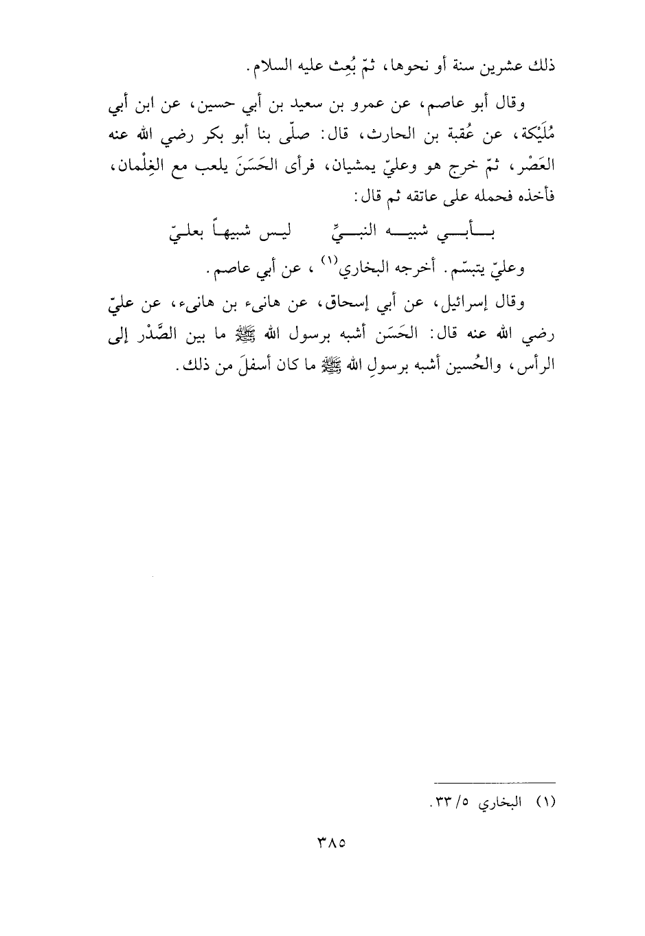 وقال إسرائيل، عن أبي إسحاق، عن هانئ عن علي -رضي الله عنه- قال: الحسن أشبه برسول الله صلى الله عليه وسلم ما بين الصدر إلى الرأس، والحسين أشبه برسول الله صلى الله عليه وسلم ما كان أسفل من ذلك.