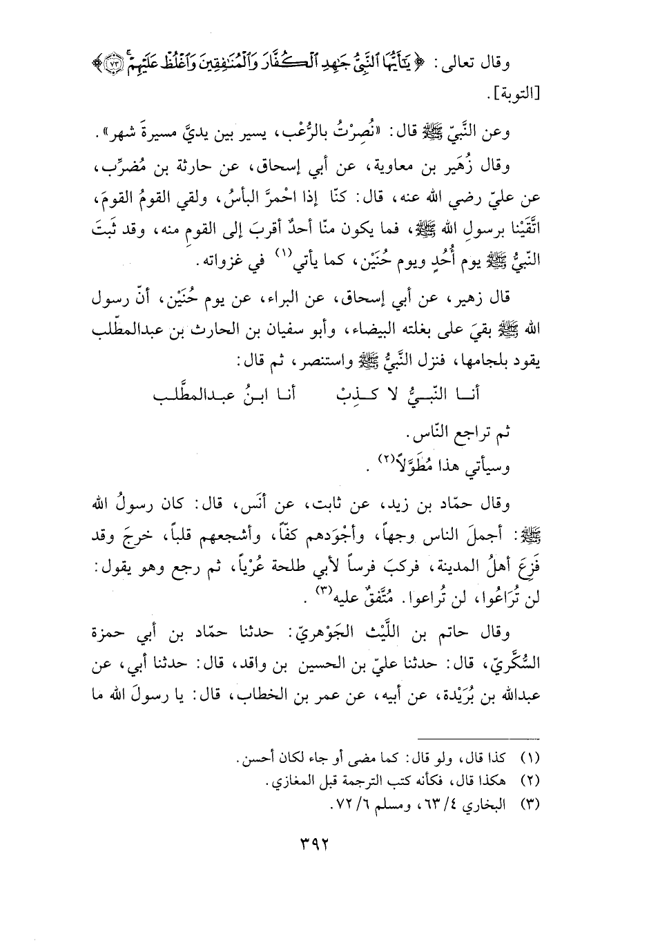 وقال زهير بن معاوية، عن أبي إسحاق، عن حارثة بن مضرب، عن علي -رضي الله عنه- قال: كنا إذا احمر البأس، ولقي القوم القوم، اتقينا برسول الله صلى الله عليه وسلم، فما يكون منا أحد أقرب إلى القوم منه، وقد ثبت النبي صلى الله عليه وسلم يوم أحد ويوم حنين، كما يأتي في غزواته.