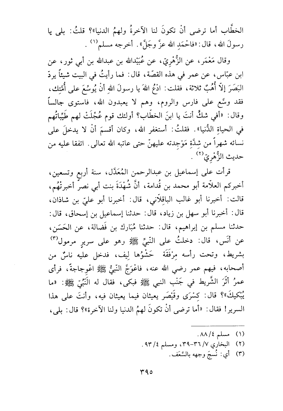 قرأت على إسماعيل بن عبد الرحمن المعدل، سنة أربع وتسعين، أخبركم العلامة أبو محمد بن قدامة، أن شهدة بنت أبي نصر أخبرتهم، قالت: أخبرنا أبو غالب الباقلاني، قال: أخبرنا أبو علي بن شاذان، قال: أخبرنا أبو سهل بن زياد، قال: حدثنا إسماعيل بن إسحاق، قال: حدثنا مسلم بن إبراهيم، قال: حدثنا مبارك بن فضالة، عن الحسن، عن أنس قال: دخلت على النبي صلى الله عليه وسلم وهو على سرير مرمول بشريط، وتحت رأسه مرفقة حشوها ليف، فدخل عليه ناس من أصحابه فيهم عمر -رضي الله عنه- فاعوج النبي صلى الله عليه وسلم اعوجاجة، فرأيى عمر أثر الشريط في جنب النبي صلى الله عليه وسلم فبكى، فقال له النبي صلى الله عليه وسلم: "ما يبكيك"؟ قال: كسرى وقيصر يعيثان فيما يعيثان فيه، وأنت على هذا السرير! فقال: "أما ترضى أن تكون لهم الدنيا ولنا الآخرة"؟ قال: بلى،