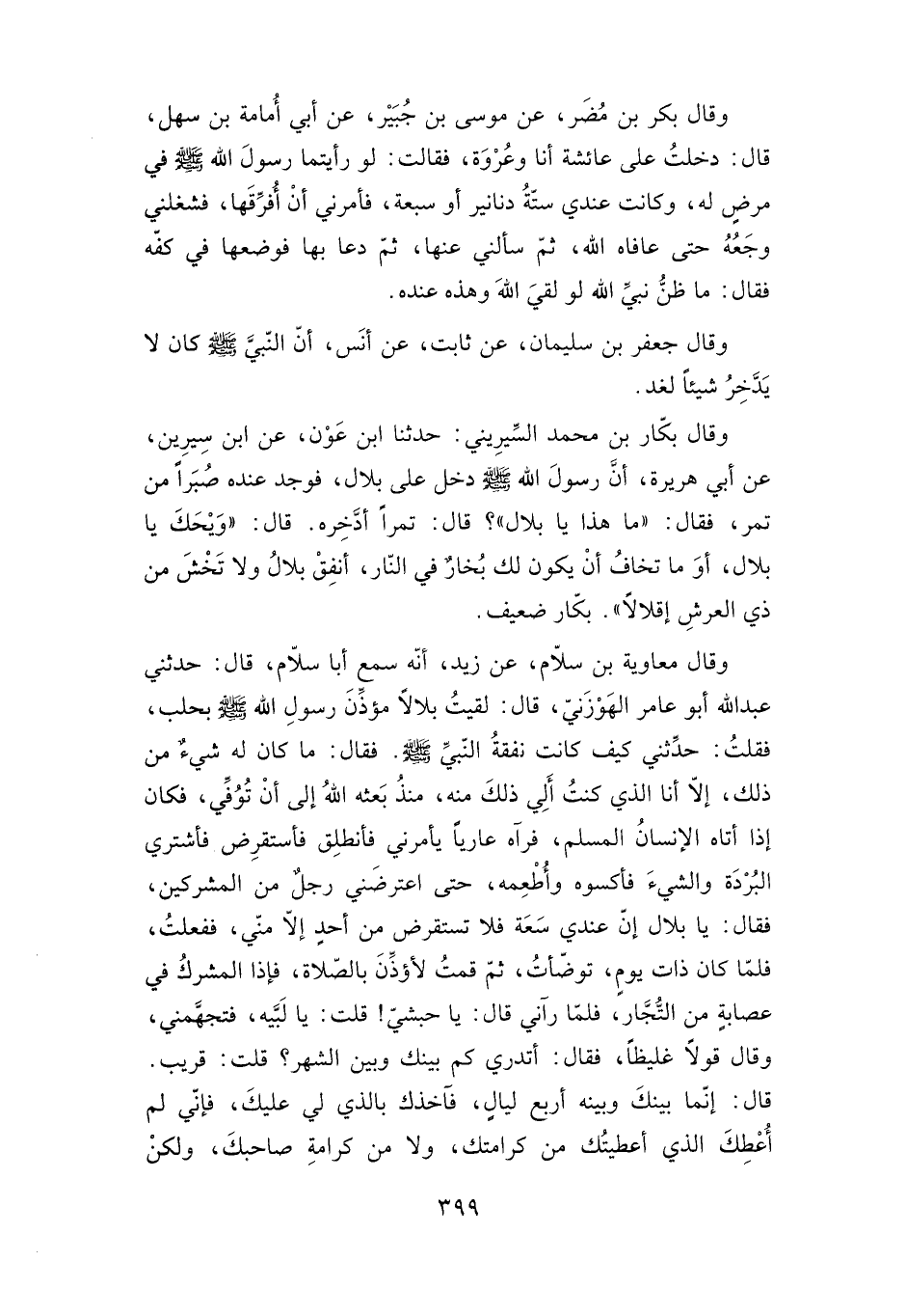 تمرا أدخره. قال: "ويحك يا بلال، أو ما تخاف أن يكون لك بخار في النار، أنفق بلال ولا تخش من ذي العرش إقلالا". بكار ضعيف.