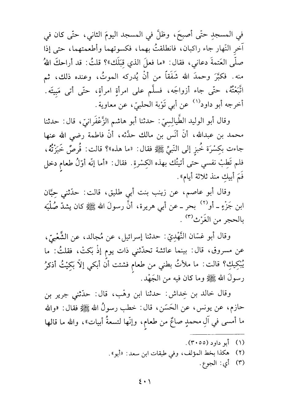 في المسجد حتى أصبح، وظل في المسجد اليوم الثاني، حتى كان في آخر النهار جاء راكبان، فانطلقت بهما، فكسوتهما وأطعمتهما، حتى إذا صلى العتمة دعاني فقال: "ما فعل الذي قبلك"؟ قلت: قد أراحك الله منه فكبر وحمد الله شفقا من أن يدركه الموت، وعنده ذلك، ثم اتبعته، حتى جاء أزواجه، فسلم على امرأة امرأة، حتى أتى مبيته. أخرجه أبو داود عن أبي توبة الحلبي، عن معاوية.