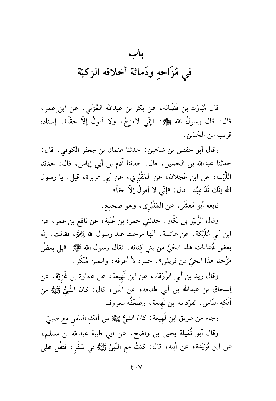 قال مبارك بن فضالة، عن بكر بن عبد الله المزني، عن ابن عمر، قال: قال رسول الله صلى الله عليه وسلم: "إني لأمزح، ولا أقول إلا حقا". إسناده قريب من الحسن.