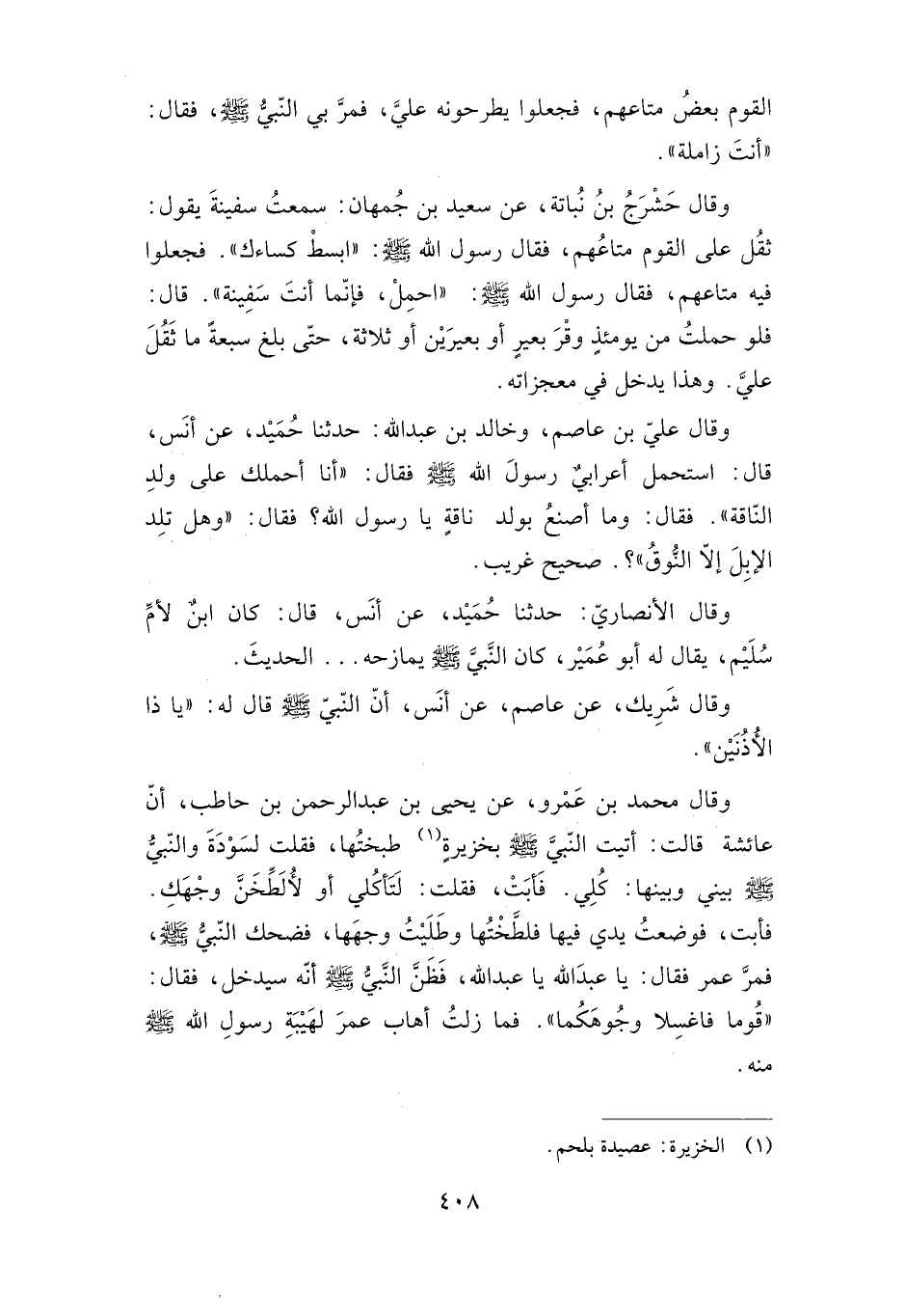 وقال محمد بن عمرو، عن يحيى بن عبد الرحمن بن حاطب، أن عائشة قالت: أتيت النبي صلى الله عليه وسلم بخزيرة طبختها، فقلت لسودة والنبي صلى الله عليه وسلم بيني وبينها: كلي فأبت، فقلت: لتأكلي أو لألطخن وجهك فأبت، فوضعت يدي فيها فلطختها وطليت وجهها، فضحك النبي صلى الله عليه وسلم، فمر عمر فقال: يا عبد الله يا عبد الله، فظن النبي صلى الله عليه وسلم أنه سيدخل، فقال: "قوما فاغسلا وجوهكما". فما زلت أهاب عمر لهيبة رسول الله صلى الله عليه وسلم منه.