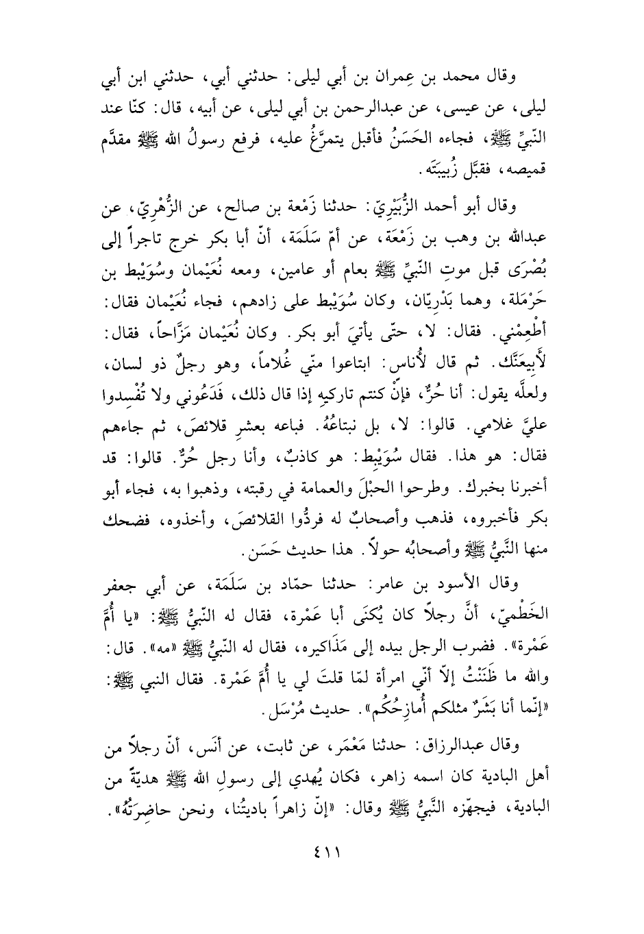 وقال الأسود بن عامر: حدثنا حماد بن سلمة، عن أبي جعفر الخطمي، أن رجلا كان يكنى أبا عمرة، فقال له النبي صلى الله عليه وسلم: "يا أم عمرة". فضرب الرجل بيده إلى مذاكيره، فقال له النبي صلى الله عليه وسلم: "مه". قال: والله ما ظننت إلا أني امرأة لما قلت لي: يا أم عمرة. فقال النبي صلى الله عليه وسلم: "إنما أنا بشر مثلكم أمازحكم". حديث مرسل.