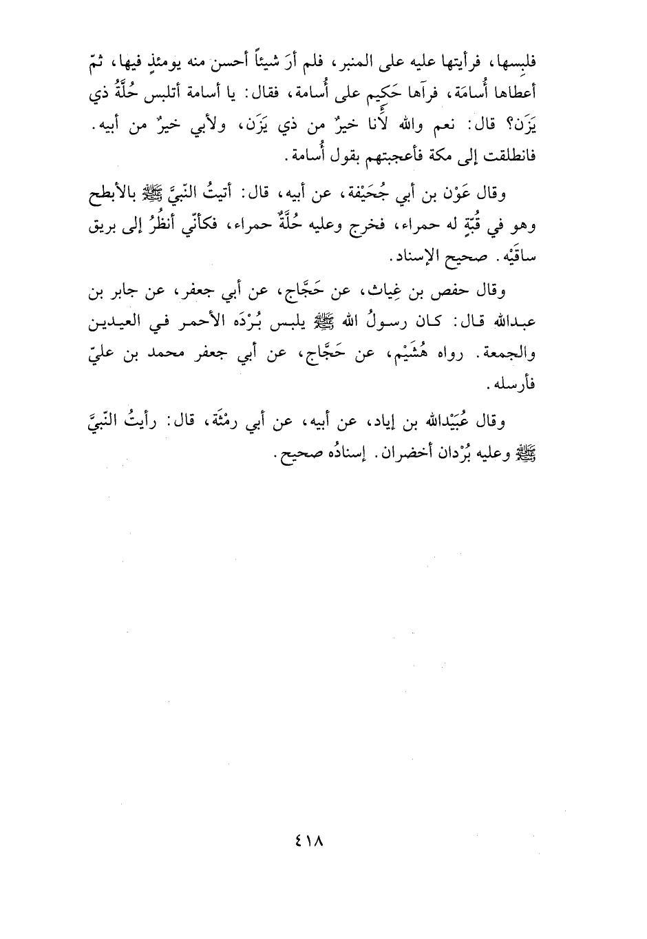 وقال عون بن أبي جحيفة، عن أبيه، قال: أتيت النبي صلى الله عليه وسلم بالأبطح وهو في قبة له حمراء، فخرج وعليه حلة حمراء، فكأني أنظر إلى بريق ساقيه. صحيح الإسناد.