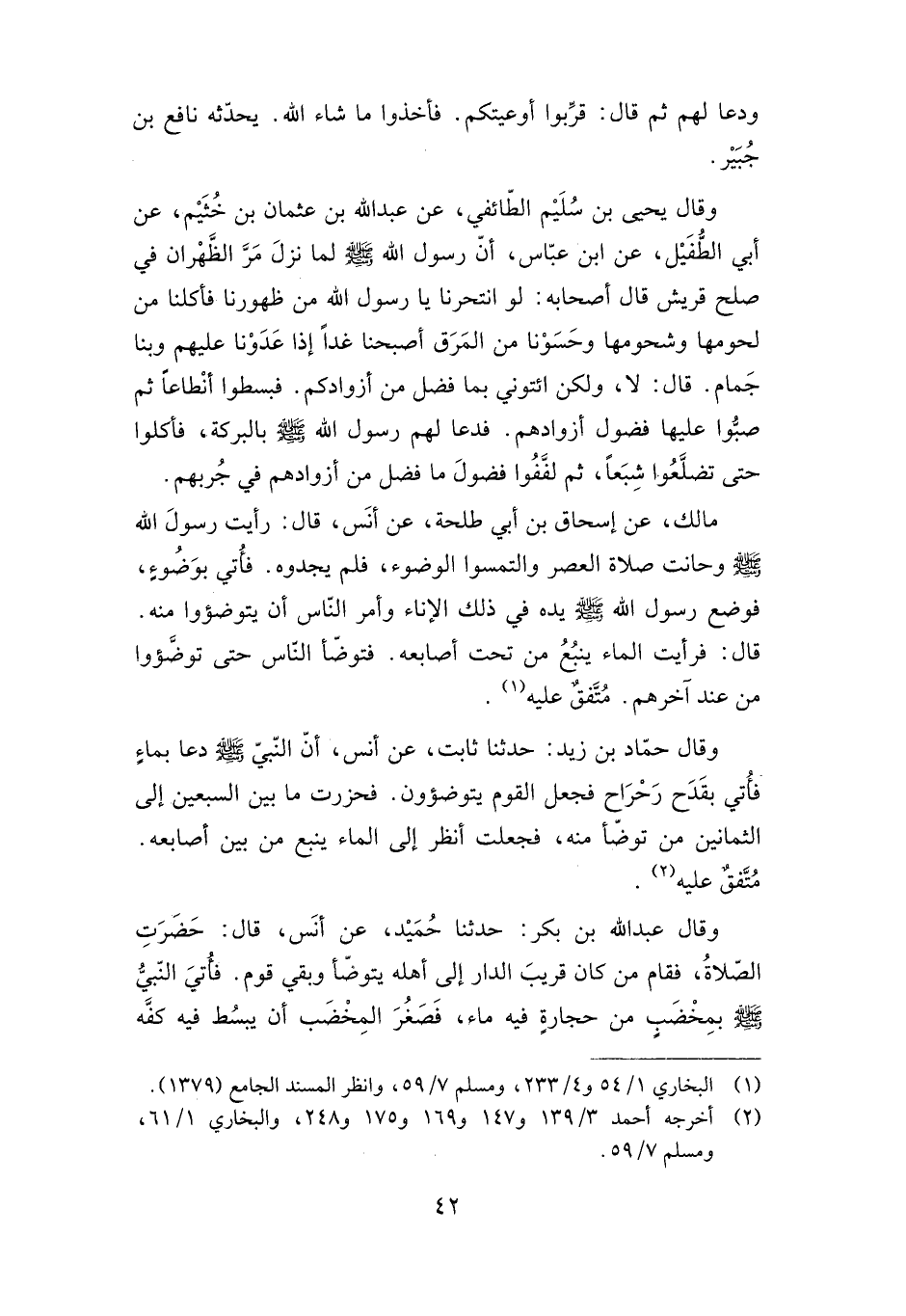 مالك، عن إسحاق بن أبي طلحة، عن أنس، قال: رأيت رسول الله صلى الله عليه وسلم وحانت صلاة العصر والتمسوا الوضوء، فلم يجدوه. فأتى بوضوء، فوضع رسول الله صلى الله عليه وسلم يده في ذلك الإناء وأمر الناس أن يتوضؤوا منه. قال: فرأيت الماء ينبع من تحت أصابعه. فتوضأ الناس حتى توضؤوا من عند آخرهم. متفق عليه.