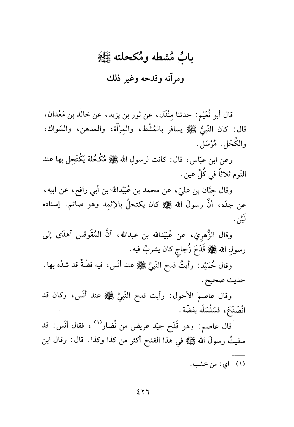 باب مشطه ومكحلته صلى الله عليه وسلم مرآته وقدحه وغير ذلك: