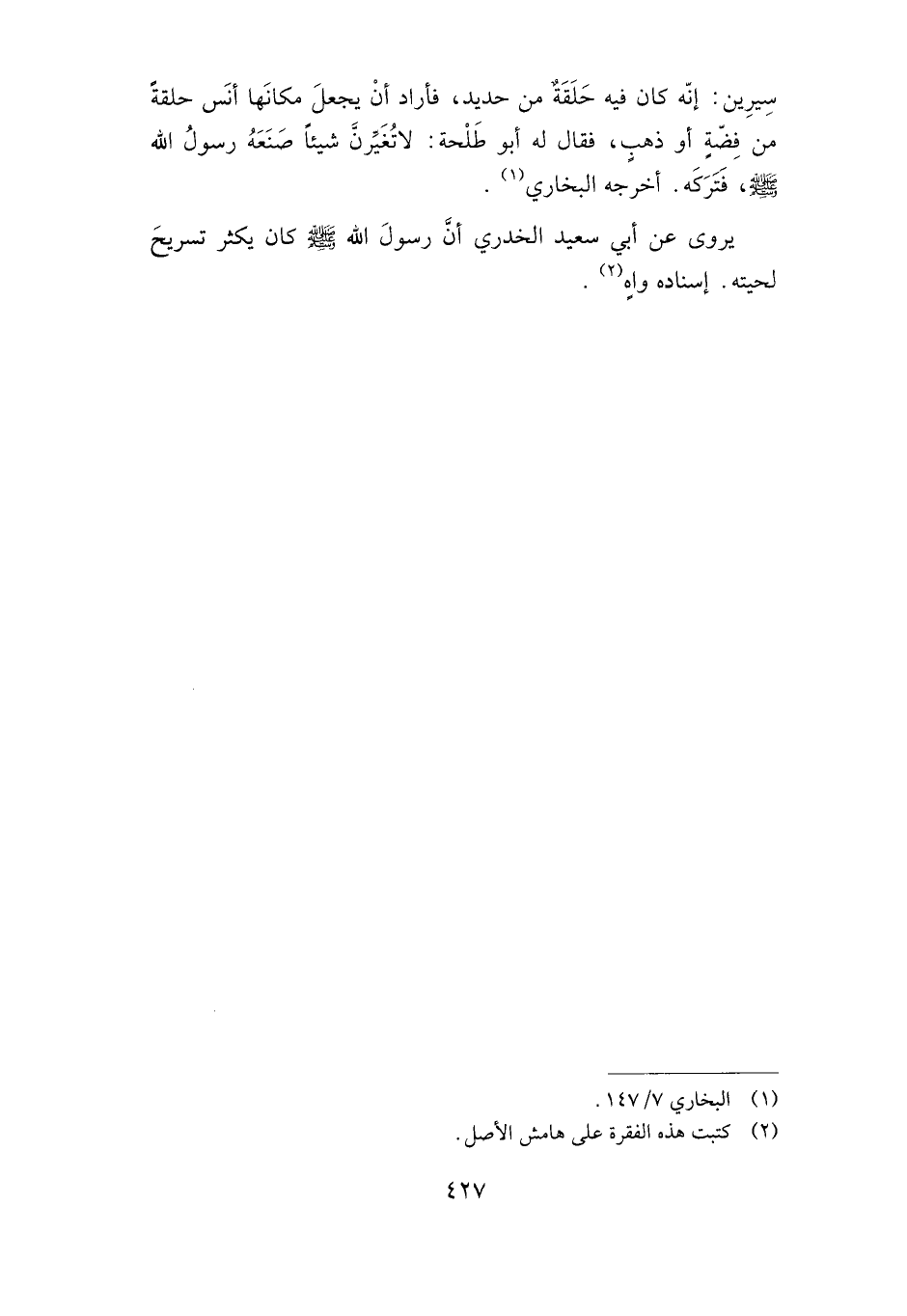 يروى عن أبي سعيد الخدري أن رسول الله صلى الله عليه وسلم كان يكثر تسريح لحيته. إسناده واه.