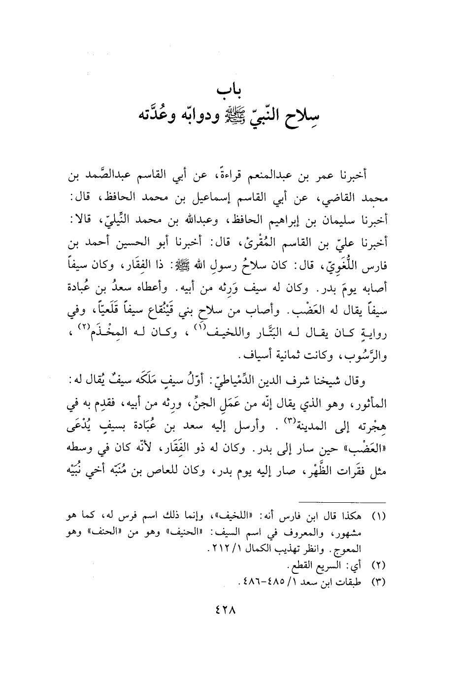 أخبرنا عمر بن عبد المنعم قراءة، عن أبي القاسم عبد الصمد بن محمد القاضي، عن أبي القاسم إسماعيل بن محمد الحافظ، قال: أخبرنا سليمان بن إبراهيم الحافظ، وعبد الله بن محمد النيلي، قالا: أخبرنا علي بن القاسم المقرئ، قال: أخبرنا أبو الحسين أحمد بن فارس اللغوي، قال: كان سلاح رسول الله صلى الله عليه وسلم: ذا الفقار، وكان سيفا أصابه يوم بدر. وكان له سيف ورثه من أبيه، وأعطاه سعد بن عبادة سيفا يقال له: العضب وأصاب من سلاح بني قينقاع سيفا قلعيا، وفي رواية كان يقال له: البتار واللخيف، وكان له المخذم، والرسوب، وكانت ثمانية أسياف.