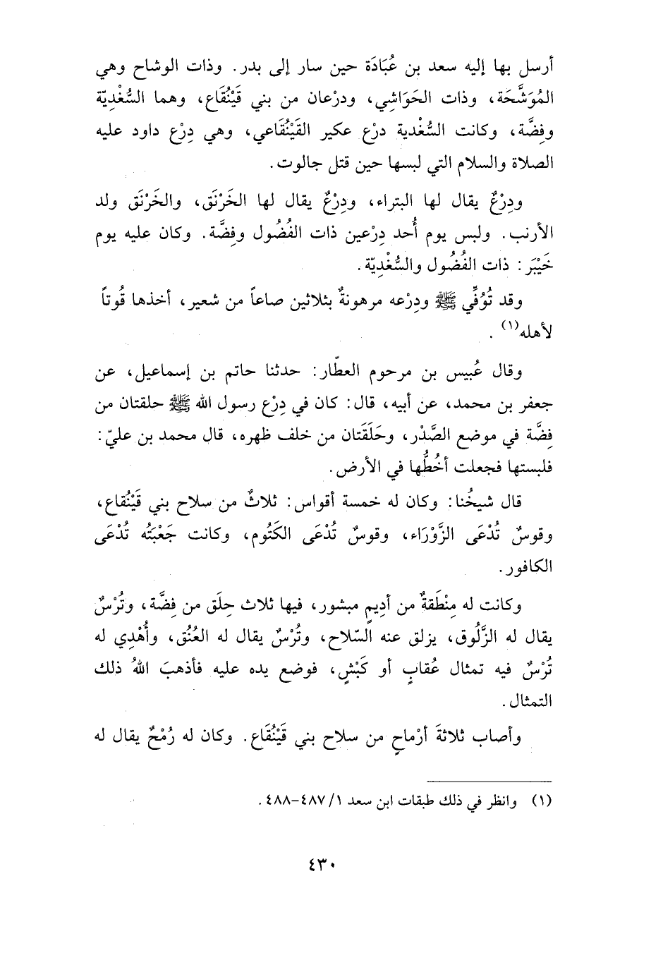 أرسل بها إليه سعد بن عبادة حين سار إلى بدر. وذات الوشاح وهي الموشحة، وذات الحواشي، ودرعان من بني قينقاع، وهما السغدية وفضة، وكانت السغدية درع عكير القينقاعي، وهي درع داود -عليه الصلاة والسلام- التي لبسها حين قتل جالوت.