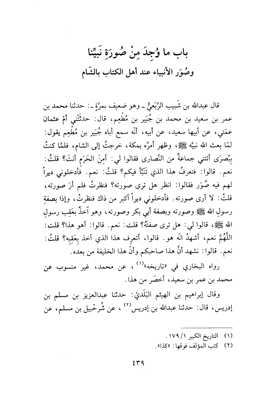 قال عبد الله بن شبيب الربعي وهو ضعيف بمرة: حدثنا محمد بن عمر بن سعيد بن محمد بن جبير بن مطعم، قال: حدثتني أم عثمان عمتي، عن أبيها سعيد، عن أبيه، أنه سمع أباه جبير بن مطعم يقول: لما بعث الله نبيه صلى الله عليه وسلم، وظهر أمره بمكة، خرجت إلى الشام، فلما كنت ببصرى أتتني جماعة من النصارى فقالوا لي: أمن الحرم أنت؟ قلت: نعم قالوا: فتعرف هذا الذي تنبأ فيكم؟ قلت: نعم. فأدخلوني ديرا لهم فيه صور فقالوا: انظر هل ترى صورته؟ فنظرت فلم أر صورته، قلت: لا أرى صورته، فأدخلوني ديرا أكبر من ذاك فنظرت، وإذا بصفة رسول الله صلى الله عليه وسلم وصورته وبصفة أبي بكر وصورته، وهو آخذ بعقب رسول الله صلى الله عليه وسلم، قالوا لي: هل ترى صفته؟ قلت: نعم قالوا: أهو هذا؟ قلت: اللهم نعم، أشهد أنه هو. قالوا: أتعرف هذا الذي أخذ بعقبه؟ قلت: نعم قالوا: نشهد أن هذا صاحبكم وأن هذا الخليفة من بعده.