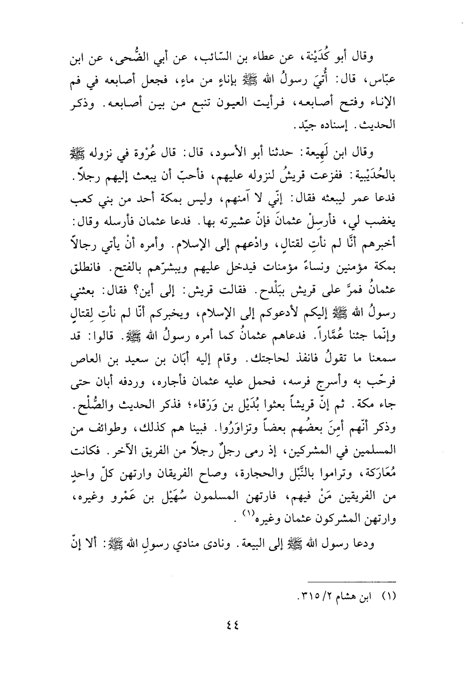 وقال ابن لهيعة: حدثنا أبو الأسود، قال: قال عروة في نزوله صلى الله عليه وسلم بالحديبية: ففزعت قريش لنزوله عليهم، فأحب أن يبعث إليهم رجلا. فدعا عمر ليبعثه فقال: إني لا آمنهم، وليس بمكة أحد من بني كعب يغضب لي، فأرسل عثمان فإن عشيرته بها. فدعا عثمان فأرسله وقال: أخبرهم أنا لم نأت لقتال، وادعهم إلى الإسلام. وأمره أن يأتي رجالا بمكة مؤمنين ونساء مؤمنات فيدخل عليهم ويبشرهم بالفتح. فانطلق عثمان فمر على قريش ببلدح. فقالت قريش: إلى أين؟ فقال: بعثني رسول الله صلى الله عليه وسلم إليكم لأدعوكم إلى الإسلام، ويخبركم أنا لم نأت لقتال وإنما جئنا عمارا. فدعاهم عثمان كما أمره رسول الله صلى الله عليه وسلم. قالوا: قد سمعنا ما تقول فانفذ لحاجتك. وقام إليه أبان بن سعيد بن العاص فرحب به وأسرج فرسه، فحمل عليه عثمان فأجاره، وردفه أبان حتى جاء مكة. ثم إن قريشا بعثوا بديل بن ورقاء؛ فذكر الحديث والصلح. وذكر أنهم أمن بعضهم بعضا وتزاوروا. فبيناهم كذلك، وطوائف من المسلمين في المشركين، إذ رمى رجل رجلا من الفريق الآخر. فكانت معاركة، وتراموا بالنبل والحجارة، وصاح الفريقان وارتهن كل واحد من الفريقين من فيهم، فارتهن المسلمون سهيل بن عمرو وغيره، وارتهن المشركون عثمان وغيره.